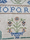 This listing is for a beautiful, large vintage cross-stitch sampler in a dark wood frame. This piece of handmade folk art features a classic layout with the complete alphabet, decorative floral borders, and a charming pastoral farm scene. Features: Dimensions: Measures approximately 25.5" W x 20" H (including frame). Design: Traditional sampler motifs including an alphabet, flowers, birds, a man with a dog, trees, and a house/church building. Condition: The cross-stitching and the wooden frame are in very good vintage condition. The paper backing on the reverse side of the frame is torn, which is typical for vintage pieces (see photos). The front of the piece displays beautifully. Handmade & Unique: A one-of-a-kind, hand-stitched piece perfect for farmhouse or country-style decor. Please review all photos carefully as they are part of the item description.