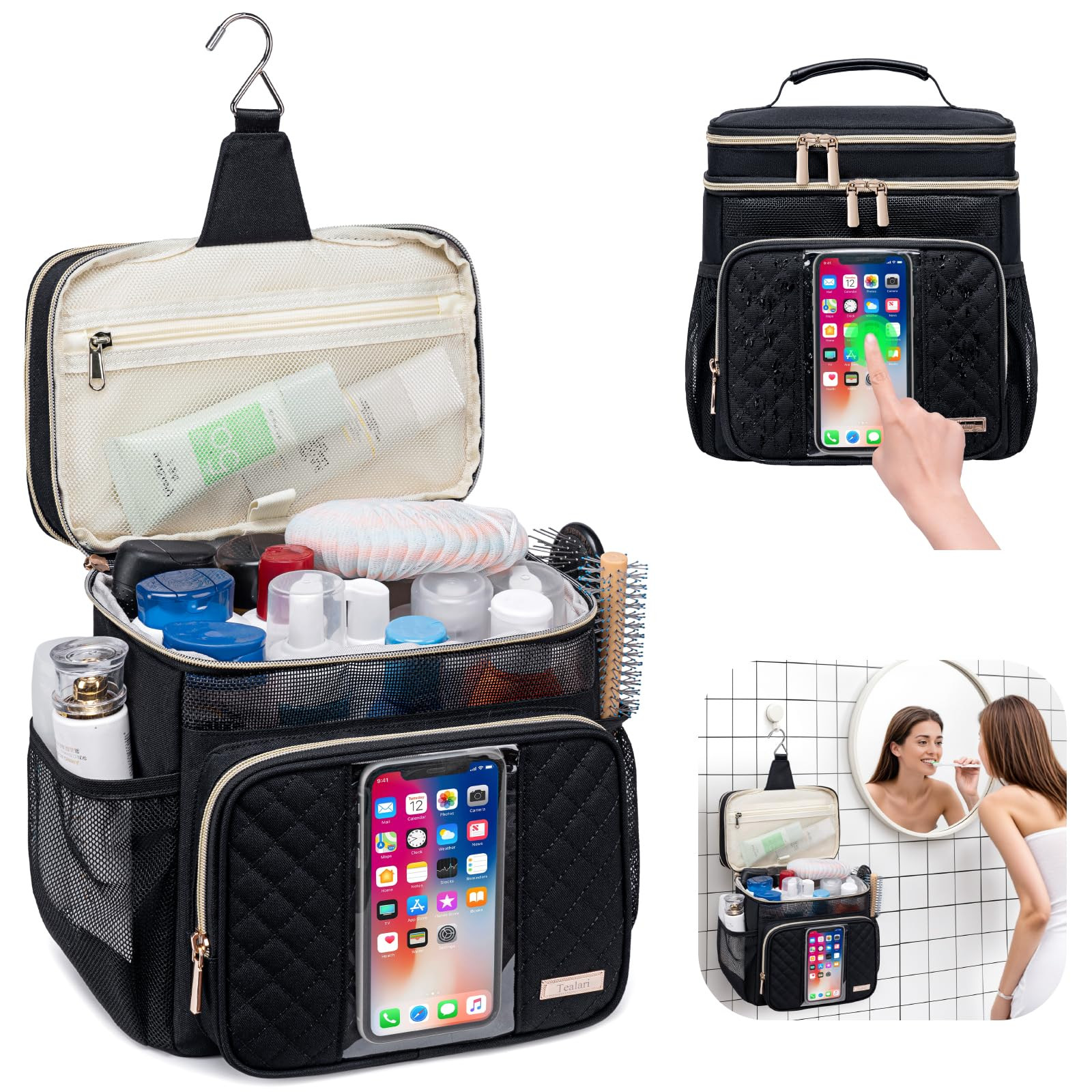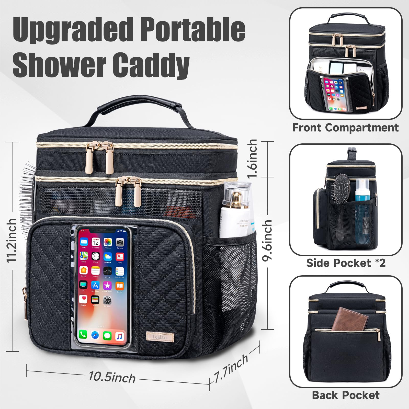 【Fashion Portable Shower Caddy For College Dorm】 Made of premium water resistant oxford fabric and PVC breathable mesh materials, The shower caddy bag has a mesh designed, convenient to ventilate quick dry and drain, The easy-to-dry fabric shower tote bag is very breathable, not easy to get wet, keeping toiletries clean and dry, reinforced seams in the hanging portion make it less prone to tearing, exquisite gold-plated zippers, smooth and durable, Size: 10.5"L x 7.7"W x 11.2"H, Weight 1.2 lbs, easy to carry 【Large Capacity & Versatile Compartment Toiletry Bag】The shower bag total 3 main zippered compartments and 8 pockets,7 flexible holders, ample pockets keep your toiletry items and cosmetics perfectly placed, zipper pocket on the inner top,front and back for convenient to store dry items and small essentials,7 flexible holders in different size to hold bottles,cosmetics and other items that cannot be placed upside down, mesh pockets on both sides for additional storage,The touchable transparent phone waterproof pocket for making and receiving calls,watching videos and listening to music 【Upgraded Portable Shower Caddy With Hanging Hook】This upgraded shower caddy college dorm room essentials,bring convenience to your life,Compared to the standard shower bag, it adds a separate compartment at the top for small cosmetics, toothpaste and toothbrush, the strong metal hook on the top, can hold up to 15 kg, The shower bag is high-quality and new design, classic shape and popular color, the large opening design of this makeup organizer bag is more convenient to take,and easily store your full-size toiletries, cosmetics and daily items 【Multi-Purpose Travel Essentials Toiletry Bag 】This shower caddy is suitable not only for daily family bathing and storage organizer, but also be a perfect life partner for college dorm room essentials, makeup, camping, travel, beach, swimming, cruise ship, gym, bathroom and business trip, In addition, this multi-functional travel makeup bag can be folded to save space when not in use, Easy to carry 【Perfect Idea Gifts】 This travel shower caddy tote bag also are perfect ideal gifts for family / friends / boys and girls, Perfect mother's day gifts, birthday gifts, Christmas gifts, graduation gifts, anniversary gifts for him her, He/she will love and use this toiletry bag every day