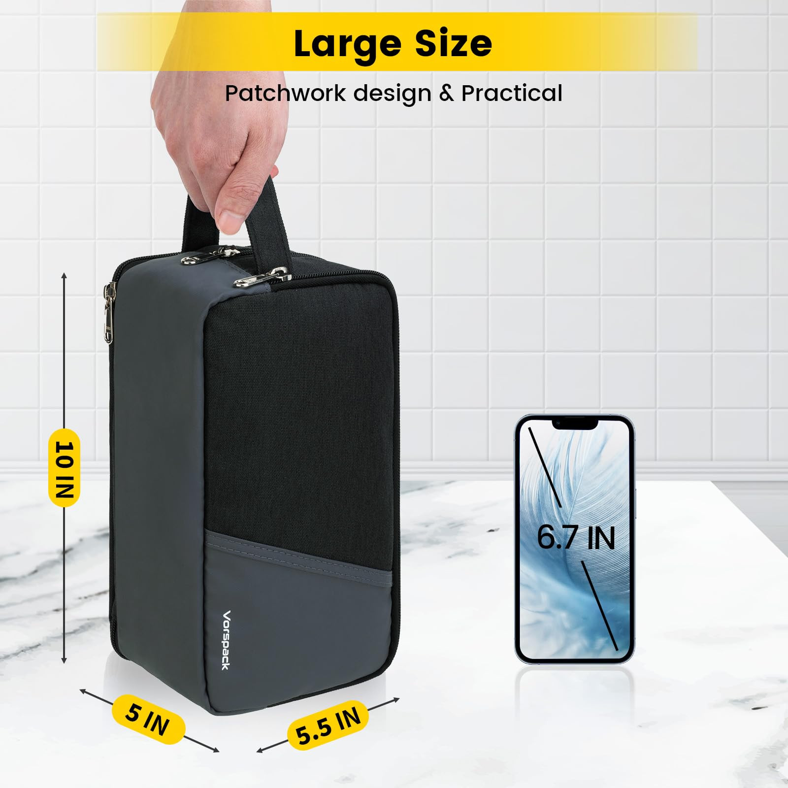 Large capacity: Measures 10 x 5 x 5.5 inches, the toiletry bag with 1 spacious main compartment is roomy enough to fit most daily toiletries. In addition, featuring 3 small mesh pockets and 3 elastic bands inside, this men toiletry bag can keep your toiletries upright and organized Separate compartments: This toiletries bag has 2 side compartments. The front compartment can keep your toiletries in place for easy access. The back waterproof compartment of this toiletry bags can keep wet and dry items separated Quality & water-resistant materials: These toiletry bags for traveling adopt a 600D polyester patchwork design that is sturdy and without any odor. Besides, this toiletries bag for men has a water-resistant surface that can keep your items from splashed water Smooth SBS zipper & handy handle: This travel bag for toiletries comes with smooth SBS zippers for easy opening and closing. The side handle of the toiletry travel bag makes it convenient to carry or hang Versatile usages & perfect gift: Suitable for both daily use and travel use. These mens toiletry bags for traveling can used as a dopp kit, hygiene bag, bathroom bag, cosmetic bag, makeup bag, shaving bag, etc. Besides, this mens travel bag toiletry is also a practical gift for your friends or families on Father's Day, Thanksgiving Day, Christmas Day, and so on