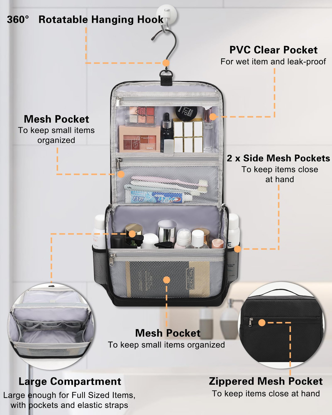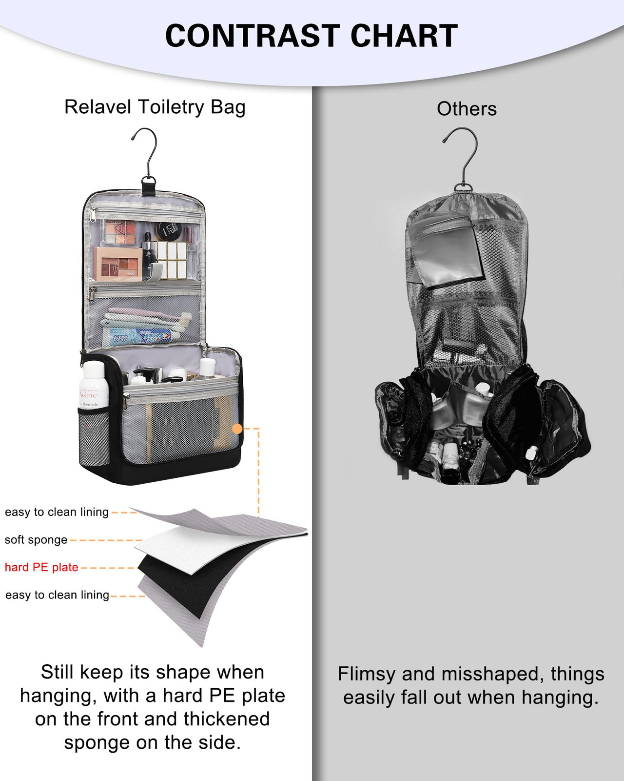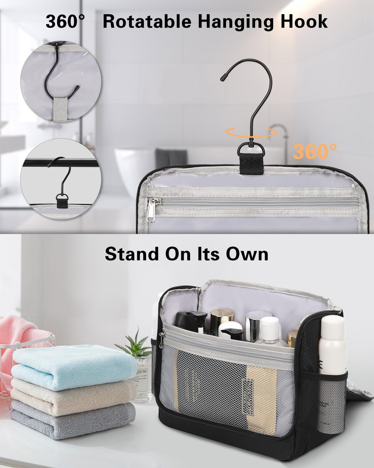 Unique Design: toiletry bag has a unique design with a hard PE plate of the main compartment, keeps its shape when hanging, does not worry about dropping things, easy access to the items. More convenient and practical than the same type of toiletry bag on the market. Fully open design that gives you a comprehensive glimpse of your stuff. Large Capacity and Multiple Compartment: Size 10.6 x 4.7 x 9 inches (L x W x H, closed). The travel toiletry bag has multiple compartments that can perfectly organize all your toiletries, cosmetics, and accessories. The inner main compartment with mesh pockets and elastic straps holds bottles upright. 360° Rotatable Hanging Hook: The toiletry bag for men with a 360° swivel non-slip metal hanging hook for versatile hanging options. It is big enough to allow you to hang it up on the bathroom, door, closet rod, towel rack, coat hook, door knob, etc. Water Resistant and Easy to Clean: Made of high-quality Nylon material, waterproof and tear & scratch resistant, lightweight nylon fabric provides all-day carry comfort. Special layer lining and PVC for easy to clean. The dual-way zippers are for easy access to the items. The added convenience of a grab handle ensures easy portability. Lightweight & Travel Portable: Weighs only 0.7-0.8 lbs. The toiletry bag is just for traveling, gym, business trips, camping, beach, and so on. It is an awesome gift for your family, friends, wife, daughter, and mom for Christmas, Halloween, Mother's Day, Valentine's Day, and birthday.