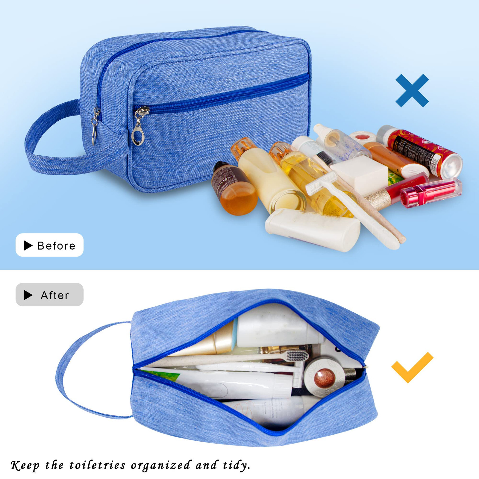 [Large Capacity]: The Toiletry Bag (10.23”x5.90”x3.93”) is large enough to hold many toiletries or cosmetics. Helps to store the toiletries from being squeezed by large items. Keeps the items organized and easy to get. Save the luggage space and keep it tidy. [High-Quality]: Made of high-quality 600D oxford fabric, the fabric is thick and durable, which is not easily worn and damaged by hard or sharp objects. Meanwhile, the fabric is waterproof and dustproof, which can protect the items and easy to clean. the High-quality metal zipper can be pulled smoothly, durable and will not tear and wear easily, suitable for long-term use. [Perfect Design]: The toiletry bag has a large opening design, helps to get the items easily. The comfortable handle beside the bag makes it convenient to carry. The front compartment on the bag can store small items such as cards, money, lipsticks, and more. [Multipurpose]: The toiletry bag can be used for many purposes: travel packing, business trips, home storage, dormitory storage, etc.; Even not only for toiletry bag, but also for cosmetic bag, underwear bag, handbag, etc.; All functions depend on your needs. [Excellent Customer Service]: would like to provide you with professional after-sales service, if you are not satisfied with our products, please contact us in time, we will provide you with a 100% satisfactory after-sales service.