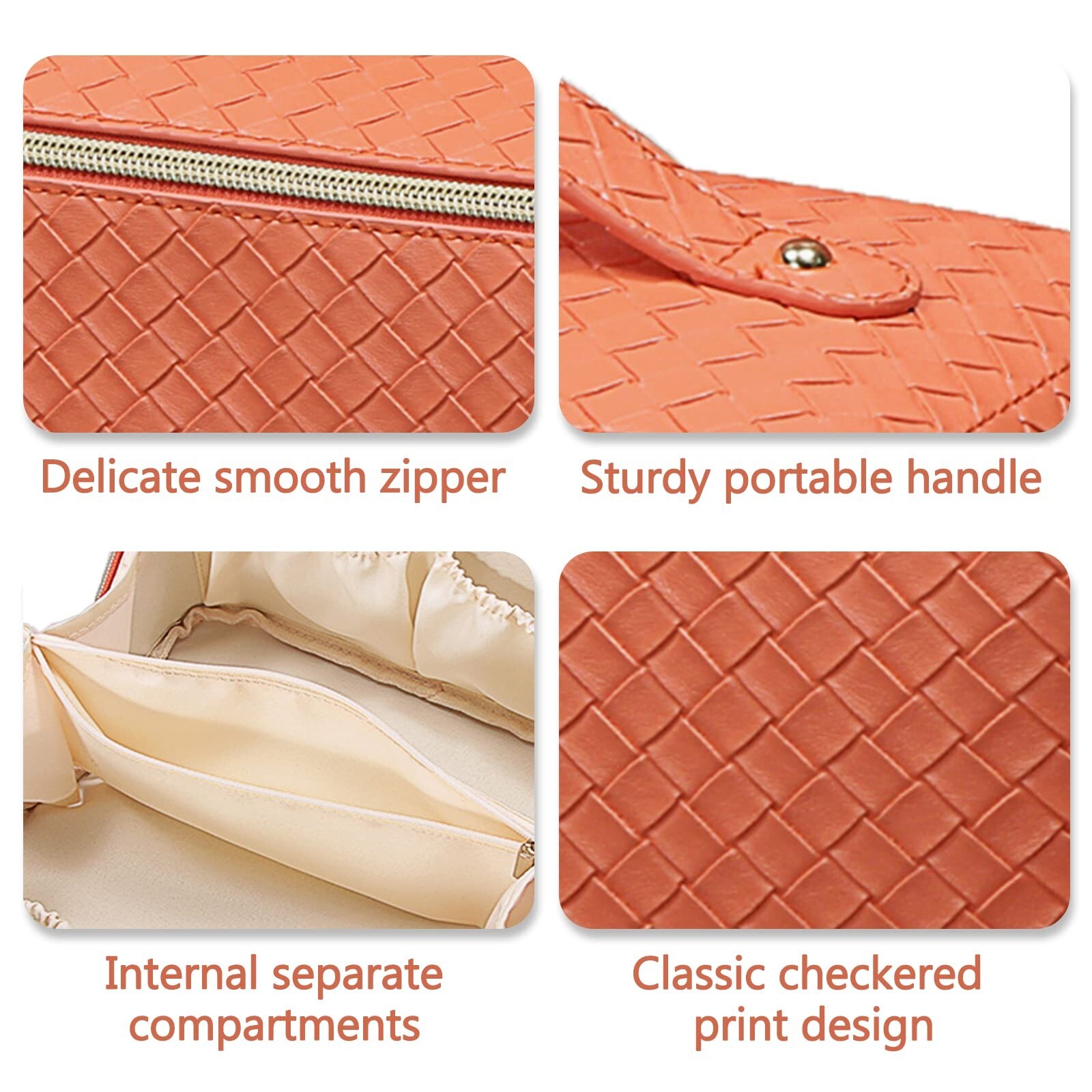Makeup Bag Large Capacity Travel Cosmetic Bag with Compartment Waterproof PU Leather Makeup Bag Portable Checkered Makeup Bag for Women and Girl Travel Orange Makeup Organizer Bag Product Details Color: Woven-Orange Brand: BAKLUCK MPN: Does not apply UPC: Does not apply EAN: Does not apply Product Dimensions: 9.3 x 4.1 x 4.3 inches Item Weight: 7.8 ounces Department: Women Manufacturer: BAKLUCK Country of Origin: China Portable Makeup Bag: The travel makeup bag features a wide opening for easy access to your cosmetics, allowing you to quickly see all contents. This design enhances your ability to apply makeup efficiently while on the move, making it a perfect companion for travel and business trips Spacious Design: Measuring 9.3 X 4.7 X 4.7 inches, this makeup travel bag fits seamlessly into suitcases or backpacks. Its thoughtful interior includes dual compartments to organize jewelry, skincare, and makeup, ensuring you can pack all essentials for short journeys conveniently Water-Resistant Material: Crafted from premium soft PU leather, this cosmetic bag is both gentle to the touch and simple to clean. The material safeguards your cosmetics and toiletries from moisture, so spills are easily managedjust wipe away any exterior marks with a damp cloth Thoughtful Present: This makeup bag is an ideal choice for anyone special in your life, perfect for occasions like Thanksgiving or Christmas. It's also a practical addition for personal use, helping to keep your vanity area tidy and organized, thus reducing clutter and optimizing space Convenient Carrying: Equipped with a comfortable top handle, this makeup bag allows for effortless transportation. Whether you are heading to a weekend getaway or a business event, its lightweight design ensures that you can carry your beauty essentials with ease wherever you go