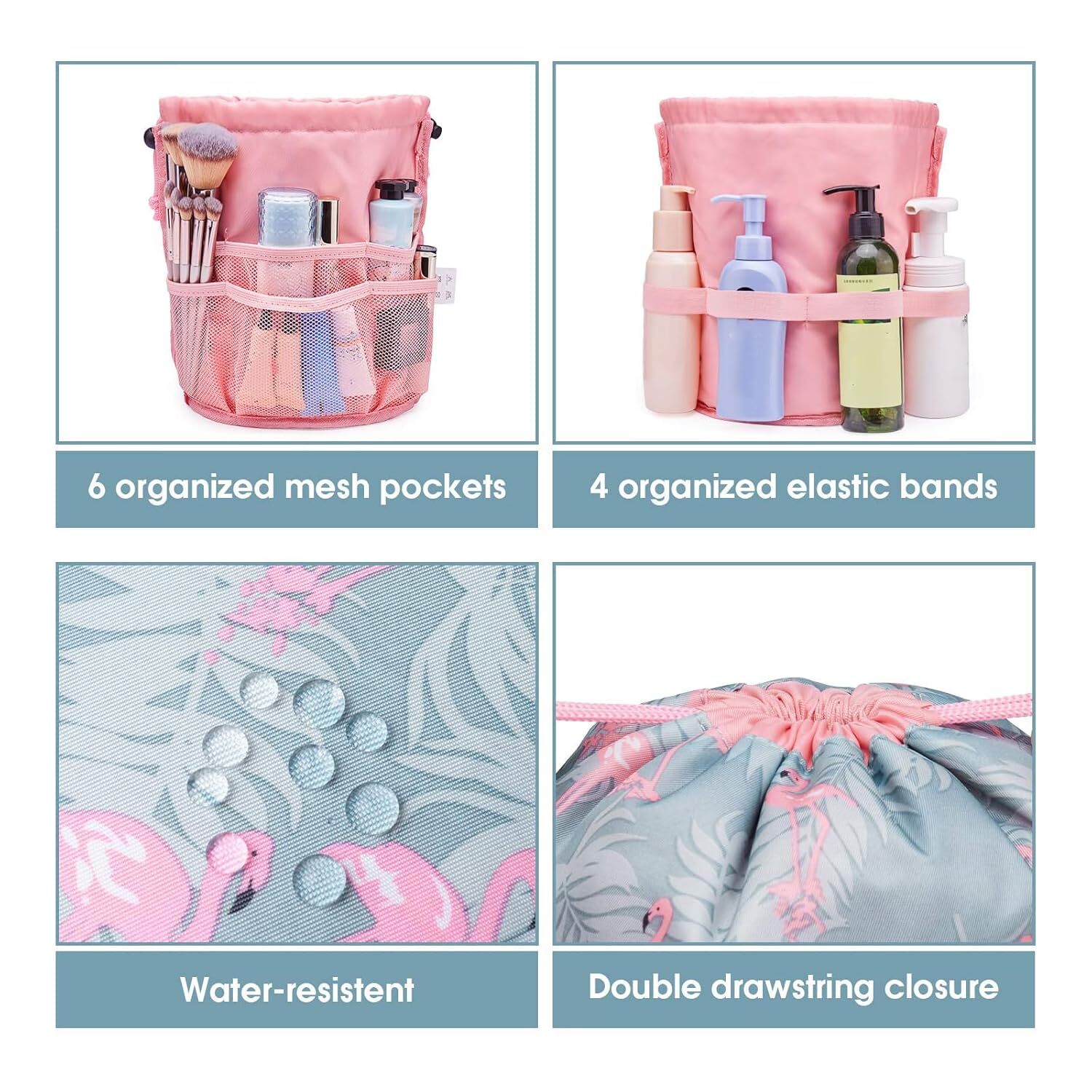 Makeup Bag Travel Cosmetic Bag Large Toiletry Organizer Waterproof for Women (Large, Flamingo) Item Description LARGE VERSION - Size 7.8"x7.8"x9.7”/20x20x25 cm, weigh only 3.2 ounce, decent size without any bulkiness MULTIPLE ORGANIZED COMPARTMENTS - Large main compartment with 6 mesh pockets, 4 elastic bands keeps items organized well,easy to grab exactly what you need without digging Great for DAILY USE or TRAVEL - Easily fit more travel-size toiletries and large skin-care products such as lotion, cream, facial cleanser, foundation, concealer, mascara, eye shadow, powder, blush, lipstick, makeup brushes CONSISTENT QUALITY - Thick fabric, upgrade nice lining, double drawstring which is easy to close. Water-resistant fabric protects items from spills, easy to wipe down TRAVEL MUST HAVES For WOMEN - Each of these cosmetic pouch has vibrant color, as travel accessories it would be a great present for women › See more product details Payment Fast and Free Shipping Shipping safe payment via eBay . Return 30 Day's returns