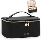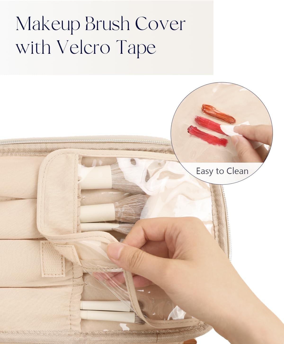 【SEPARATE BRUSHES COMPARTMENT】Featuring 4 slots with a transparent makeup brush cover equipped with Velcro tape, the top flap accommodates over ten brushes of varying sizes, while the transparent PVC cover ensures effortless cleaning and dust resistance 【VEGAN LEATHER】The Prite makeup bag is made of high-quality vegan leather, which is 100% waterproof, comfortable, soft, and environmentally friendly. The well-padded design inside the makeup bag also provides good protection and extends the overall service life of the bag 【EASY ACCESS DESIGN】Equipped with a removable Velcro divider, the bag boasts 6 lipstick slots and 2 mesh pockets, along with 1 elastic pocket inside, all of which facilitate organized storage of your cosmetics. Meanwhile, it helps you easily access your beauty products 【ROOMY CAPACITY】Size: 9.4 x 6.4 x 4.7 inches. The Prite makeup bag can easily accommodate both travel-sized toiletries and full-sized skincare products. With its vegan leather handle and excellent portability, it makes an ideal choice for both weekend trips and daily use 【EXQUISITE GIFT BOX】Every Prite cosmetic bag is packed in an exquisite gift box. Whether it's Valentine's Day, Christmas, Mother's Day, Women's Day, a birthday, or an anniversary, this stylish and practical makeup bag is the perfect choice to express your appreciation Product Description 1 Makeup Bag 2 Toiletry Bag 3 Travel Pouch 4 Gift Choice