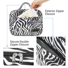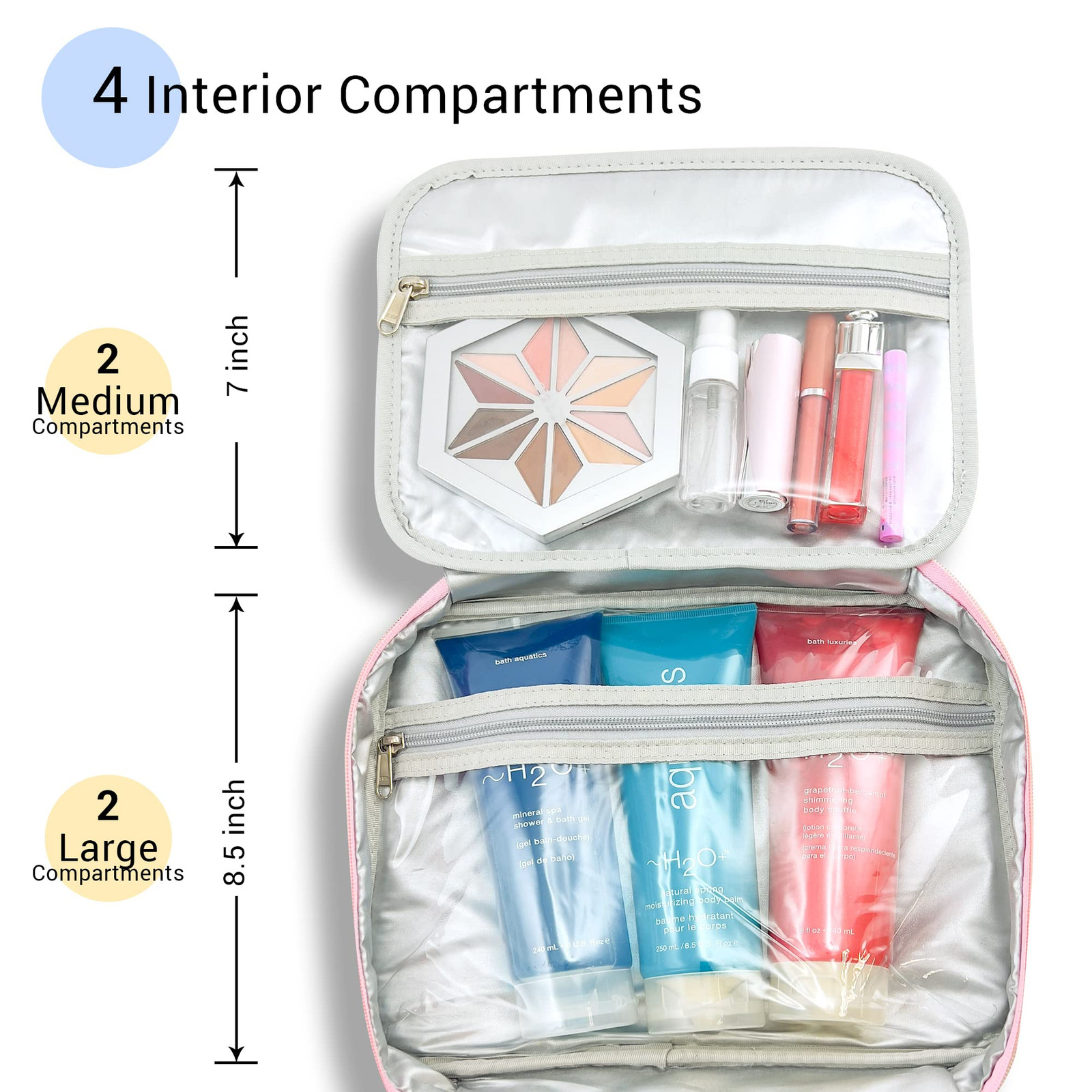 LARGE CAPACITY: Multi-functional compartments. 4 interior compartments with zipper closure pockets and 1 exterior zipper closure pocket to store your travel size and full size personal care hygiene items, toiletry accessories, or cosmetic products such as lotions, shampoo, conditioners, make up necessities, foundations, grooming products, etc. CONVENIENT & PRACTICAL: Double zipper closure ensures convenience and security. Use the included hanging hook to hang the opened and expanded bag in bathrooms or in hotel rooms when you are on the go. Allows easy access to all your toiletry necessities and accessories. Or use it at home as your bathroom organizer, home grooming and personal care items storage. VERSATILE: Suitable for your family trip to pack all men, women and kids toiletries. Double carry handle doubles as its hanging strap. Can be used as travel organizer bag for toiletry accessories, personal care items, hygiene products, grooming products, cosmetics and makeup essentials. Convenient and easy-to-carry, great for overnight staying, a long journey, gym shower and outdoor activities SPLASH & WATER PROOF: Exterior made of premium quality Polyester material that’s splash proof, interior made of sturdy water proof material. Well-padded design to keep full bag's shape and provide great protection. Sturdy stitching and heavy duty material and it can stand up many items. SIZE & COLOR: Zipped bag size is approximately H9 x W11 x D3.5 in. Opened and expanded size is approximately L40 x W11 in including hanging hook. Color: Leopard