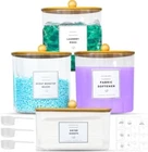 Laundry Detergent Dispenser Containers - 4 Pack Powder Clear Product Details Manufacturer: JOOBARY Part Number: joo1 Item Weight: 3.56 pounds Product Dimensions: 5.8 x 6.5 x 6.2 inches Country of Origin: China Item model number: JOO-01 Style: Transitional Finish: Laundry Pod Containers Shape: Oval Number Of Pieces: 4 Special Features: Handle Batteries Included?: No Batteries Required?: No Color: Clear Material: Plastic, Bamboo Product Dimensions: 5.8"L x 6.5"W x 6.2"H Brand: JOOBARY Finish Type: Laundry Pod Containers CLEAR PLASTIC AND BAMBOO LIDS:The 4-Pack of Laundry Detergent Containers and Tumble Dryer Holders are made of premium plastic for durability and elegance. The Laundry Detergent Dispenser containers, each decorated with bamboo lids, add a natural elegance to your home. DRYER SHEET DISPENSER:The dryer sheet dispenser comes with a lid for added convenience. It is designed with special grooves to ensure a secure grip. This dispenser can hold approximately 200 dryer sheets and is also perfect for storing dryer balls, fabric softener sheets, laundry detergent, clothespins, and other laundry essentials. PET MATERIAL: Our laundry storage containers are made of high-quality clear PET plastic, which makes it easy to find laundry materials and know when to add them. The plastic is safe and can suit various laundry room styles. MULTI-USE STORAGE ORGANIZER : You can use these luxurious-looking jars to stylishly store liquid and powder detergent, clothespin, cotton, scent boosters, laundry tablets and fabric softener. Additionally, you can place cookie and other food in them to create an elegant appearance on your kitchen countertop. PACKAGE INCLUDES: The laundry containers for organizing set includes 3 laundry containers for detergent, 1 dryer sheet container, 3 clear scoop, 6 washable waterproof labels and 1 screwdriver. Elevate your laundry room organization and storage with our stylish and multifunctional laundry detergent dispenser.