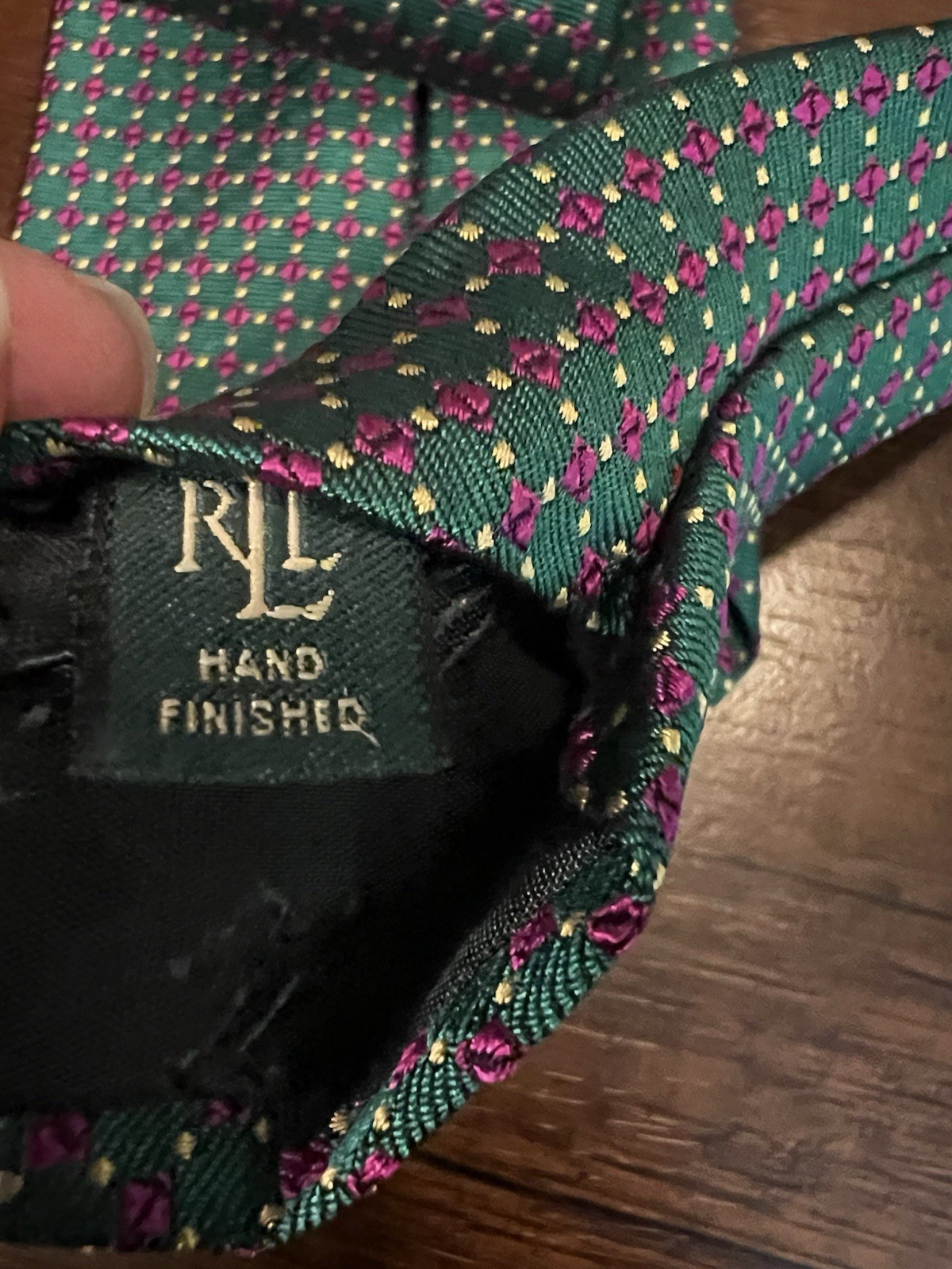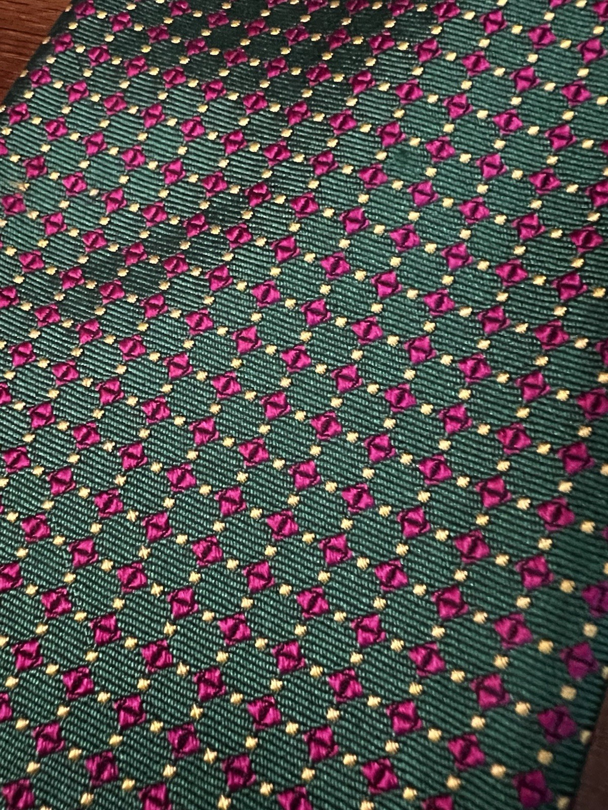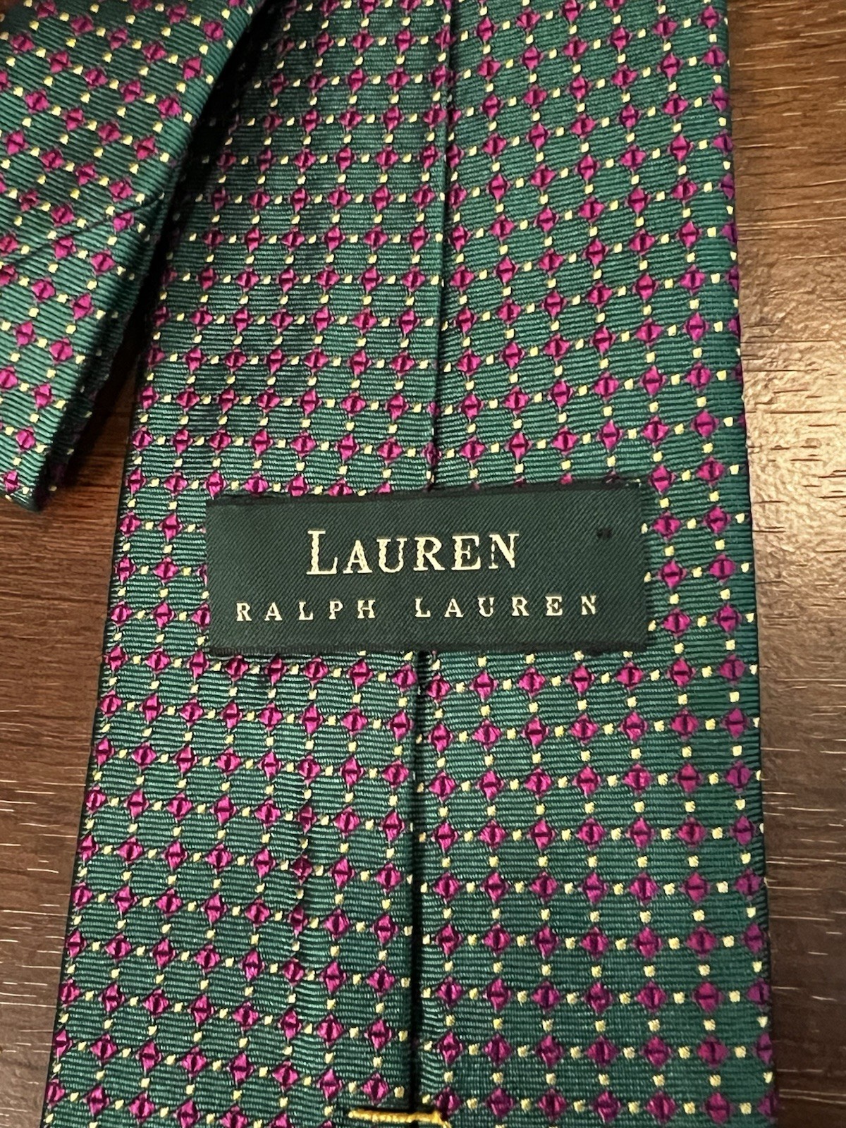 This Lauren Ralph Lauren Men's Neck Tie in green and pink geometric pattern is a classic and stylish accessory for men. Made of silk and hand-made, it showcases the designer brand's logo accents and adjustable features. The one-size tie is perfect for adding a preppy touch to any formal outfit, with the timeless design and high-quality material making it a versatile and sophisticated choice for men's fashion.