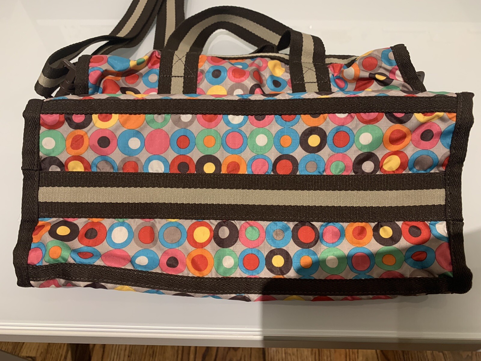 LeSportsac Crossbody Bag Purse Multicolor Circles. Condition is "Pre-owned". Shipped with USPS Priority Mail. Crossbody with adjustable strap. Strap is also removable.