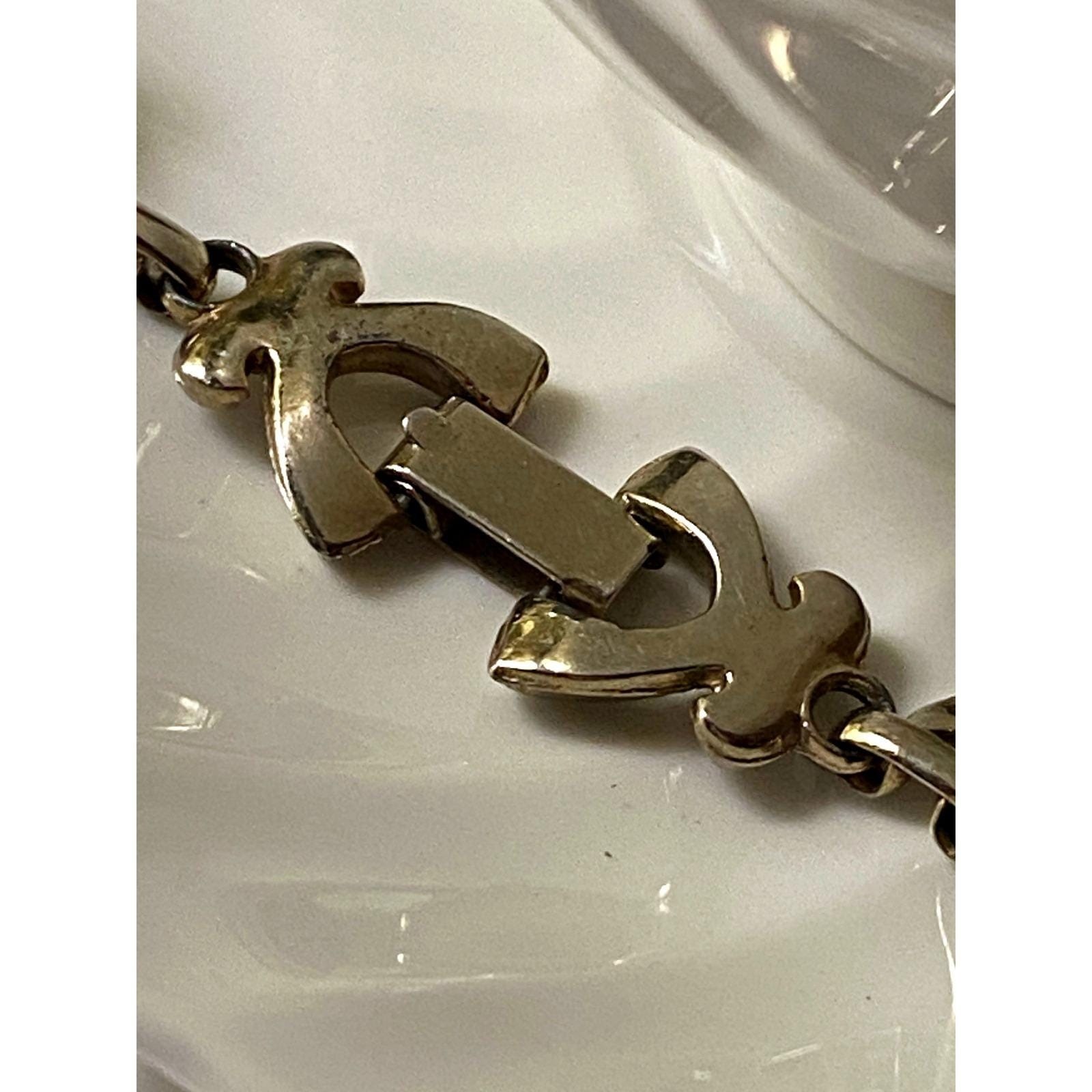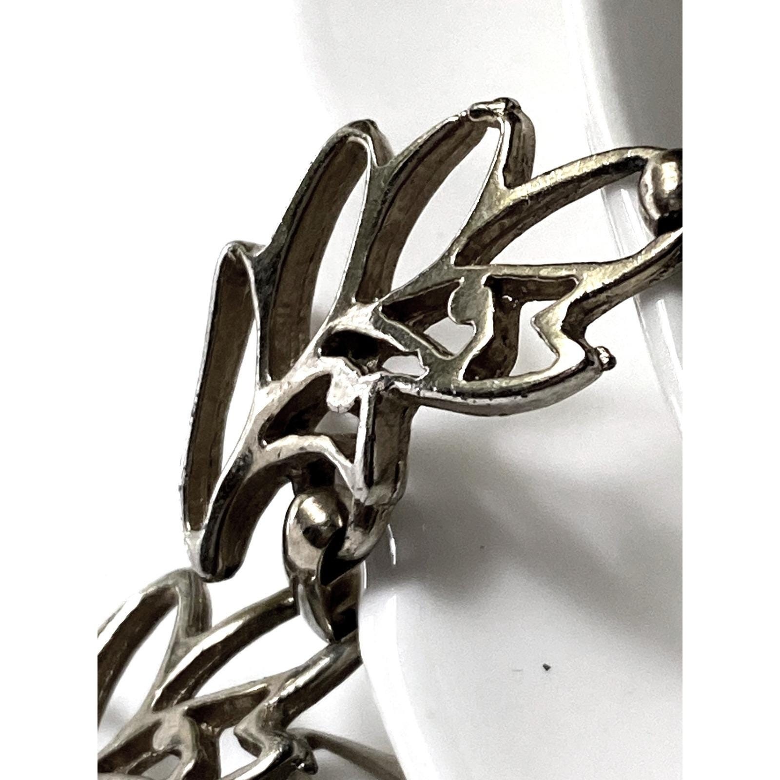 Leaf chain necklace in silver-tone metal featuring linked botanical leaf shapes in a repeating pattern. This statement necklace offers a bold, vintage-inspired look perfect for adding a touch of nature-inspired style to any outfit. Lightweight fashion jewelry with a fold-over clasp closure. Estimated Era: Late 1990s to Early 2000s Preowned in good condition with minor surface wear consistent with age. Please review all photos and reach out with any questions. leaf chain necklace, gold tone fashion jewelry, botanical statement necklace, vintage-inspired leaf necklace, bold chain link necklace, nature-inspired jewelry, costume jewelry necklace, fold-over clasp necklace, gold link statement piece This item is pre-owned and disclosed them to the best of my ability, but some overall wear and signs of use are to be expected.