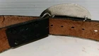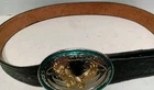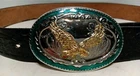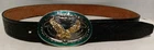 This leather belt and buckle set features a stunning raised detail flying eagle with wings spread design in a gold tone. The belt is 39 inches long and is made of high-quality leather ( has some wear, see photos). The buckle is a western style with a USA theme, making it a perfect accessory for any patriotic man. The belt is adorned with a solid pattern and the metal eagle buckle adds a touch of character to the piece. The hardware material is made in the USA. This belt and buckle set is perfect for any man who loves the western style and wants to make a statement with his accessories.