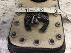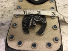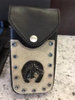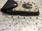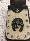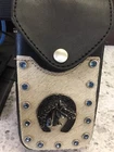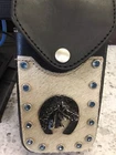 This is a very nice item. It is sturdy black leather with a strap on the back for your belt to loop thru. There are 4 heavy duty rivets that hold on the strap. The front is adorned with natural cowhide embossed with a horse,horseshoe and 13 shiny blue rivets. The piece is stitched and secured tightly. Great for your knife,cards,money whatever you want to carry. Measures 6 1/2” high x 3 -3 1/2” wide. Clean,ready to use. Check the pictures as they are part of the description. Ask questions prior to bidding. No refunds no returns Thanks Tina Allthatshimmers