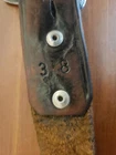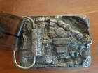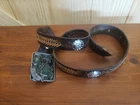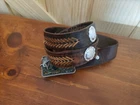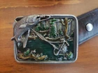 This is a leather belt size 38 with silver buckle accents and leather chevron pattern. The belt buckle is enamelled with a fishing scene and is made by Bergamot Brass Works model #P-146 in the USA. The buckle is in great condition with no loss of enamel or scratches and the belt is in good worn used condition.