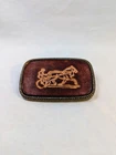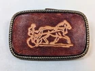 Unique Western Brass Belt Buckle. Hand Tooled Leather Featuring Harness Racing With Jockey & Horse. See pictures for closer details as they are part of the description.