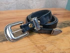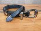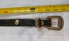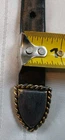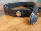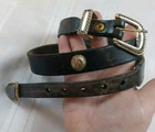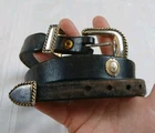 Please see all pictures for wear, mostly on the metal hardware. Elevate your style with this beautiful leather belt by Trinity. Crafted with distressed brown leather and adorned with a medallion and buckle accent, this belt is perfect for any fashion-forward woman. The belt is normal width and features an adjustable buckle, making it a versatile addition to any wardrobe. This concho belt is a must-have for any Aztec-themed outfit and is perfect for adding a touch of bohemian flair to any outfit. The belt is handmade with great attention to detail and is sure to make a statement wherever you go. So, whether you're dressing up for a night out or just running errands, this belt is the perfect accessory to complete your outfit. Your feedback is extremely important to me. If there is an issue with an order please contact me and I will do my very best to correct the situation. Please understand that most of my items are vintage and/or used and may show some wear from age and use. Items may show scuffs, fading, paint loss, marks etc. Please review all photos of a listing before purchasing. I have done my best to include all accurate details and descriptions of an items' condition. All items are sold "As Is".