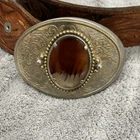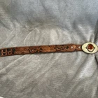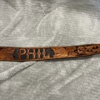 This beautiful leather belt buckle was handmade for my deceased husband. The intricate hand engraving reads "PHIL" and features a stunning 3.5" engraving of gold with a 2" amber stone. The buckle is made of genuine leather and was crafted with care in the United States. It is a one-of-a-kind piece of Western Americana that will make a great addition to any collection. Fits 36-39 inch waste