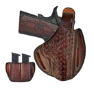 Elevate your firearm carrying experience with our premium handcrafted leather holster, expertly designed to accommodate a wide array of Glock models, including the 17, 19, 21, 23, 26, 27, 29, 30, 42, and 43x. Crafted from high-quality 3mm thick smooth leather, this holster offers both durability and style, ensuring a secure and comfortable fit for your handgun. Key Features: Basket Weave Design: Our holster features an intricate basket weave pattern, adding a touch of sophistication and individuality. This stylish design not only enhances the appearance but also provides additional grip for easier handling. Handcrafted Excellence: Each holster is meticulously handmade by skilled artisans, reflecting exceptional craftsmanship and attention to detail. The handcrafted nature ensures that every piece is unique, with a perfect balance of functionality and aesthetics. Perfect Fit for Glock Models: Custom-molded to fit a wide range of Glock models, our holster guarantees a snug and secure fit, preventing any unwanted movement. The precision molding ensures that your firearm is held securely, while still allowing for a smooth and quick draw. Premium Smooth Leather: Made from top-grade, smooth leather, our holster is designed for durability and long-lasting use. The high-quality leather not only looks sleek and professional but also provides a comfortable feel against your skin. Secure Safety Strap: Equipped with a robust safety strap, our holster ensures that your firearm stays securely in place, even during vigorous activities. The safety strap is easy to operate, allowing for quick access when needed, without compromising on security. Why Choose Our Leather Holster? Our leather holster is more than just a carrying accessory; it's a statement of quality and craftsmanship. Whether you're a professional in the field, a firearms enthusiast, or someone who values premium quality accessories, our holster is designed to meet your needs. It offers reliable protection for your firearm, ensuring that it remains in pristine condition. Comfort and Convenience: Designed with the user's comfort in mind, our holster is lightweight and easy to wear for extended periods. The smooth leather interior prevents scratches on your firearm, while the well-crafted exterior offers a professional and polished look. The basket weave design not only adds an aesthetic appeal but also enhances grip, making it easier to handle. Perfect for Every Occasion: Whether you're heading to the shooting range, on duty, or simply carrying for personal protection, our leather holster is the perfect companion. Its elegant design makes it suitable for both casual and formal settings, ensuring that you carry your firearm with confidence and style. Invest in a holster that embodies quality, style, and functionality. Order yours today and experience the difference of a handcrafted leather holster designed specifically for your Glock.