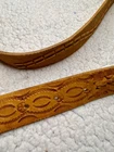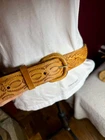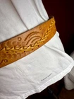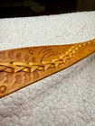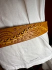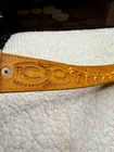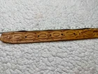 Crafted with meticulous attention to detail, this handmade leather belt showcases a unique tooled pattern, adding a touch of rustic charm to any outfit. The brown leather's quality is evident in its durability and supple texture, ensuring both comfort and longevity. This size 42 belt offers a wide width for those who prefer a substantial and stylish accessory. The belt is adorned with distinctive tooling enhancing its Western-inspired theme and making it a standout piece for any cowgirl or cowboy ensemble. Unbranded and embracing a country character, it's a testament to individual craftsmanship and style. Whether you're dressing up for a night out or adding to your everyday wardrobe, this belt brings a piece of the Western spirit to your look. measurements pictured