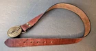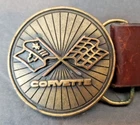 This vintage belt buckle features a classic Corvette automobile design, crafted by Indiana Metal Craft in the 1970s. The buckle is made of bronze and is in its original condition. The leather belt itself is 31.5 inches long and 1.5 inches wide, and is a unisex accessory. This item is a unique addition to any collection and is perfect for automotive enthusiasts. Buckle is 2.25 " across. please check out our other listings of vintage Corvette buckles and emblems at our e-bay store at www.timsattic.us thank you !!!