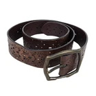Leather Belt Women XL Laser Cut Etched Studded Bourbon Brown Brass Buckle Floral