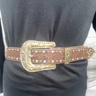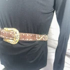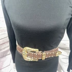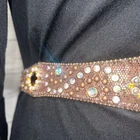 Add some western flair to your outfit with this XL leather belt for women. The brown leather belt features a snake print design with rhinestones and studs, making it a perfect accessory for a cowgirl or cowboy outfit. The belt is 50 inches wide and has a buckle closure, ensuring it stays securely in place. The silver tone metal hardware adds a touch of bling to the belt, making it perfect for any occasion. This belt is not only stylish but also functional, providing you with a comfortable and durable accessory that will last for years to come.