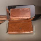 Leather Brown Crossbody Wallet Purse is a stylish and practical accessory for women on the go. Made from high-quality leather with a solid brown color and gunmetal hardware, this small purse features a zip and snap closure, along with a crossbody strap for easy carrying. It includes a convenient pouch accessory and a fabric lining in a coordinating brown color. Perfect for organizing your essentials while maintaining a fashionable look, this vintage-inspired wallet purse is a versatile addition to any outfit.