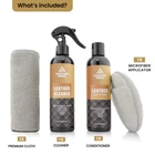 The 8oz Cleaner Spray and 8oz Conditioner Cream kit is your ultimate solution for keeping leather furniture, car interiors, couches, boots, and more in pristine condition. This complete leather care kit comes with everything you need: a powerful leather cleaner to remove dirt and grime, a premium conditioner cream to restore softness and shine, and a microfiber applicator with a premium cloth to ensure smooth, even application every time. Whether you're looking to clean and condition a leather couch, protect your car seats from cracking, or restore the look of your favorite boots, this kit is designed to meet all your leather care needs. The cleaner effectively lifts dirt while the conditioner nourishes and protects leather from drying out, cracking, or fading. Safe to use on all leather types, it’s perfect for maintaining leather furniture, car interiors, and even delicate items like handbags and shoes. Keep your leather looking fresh, vibrant, and long-lasting with the care kit. This kit is easy to use and provides professional-quality results. The 5" microfiber applicator allows for precise application, and the included cloth ensures a smooth finish. Whether you need to restore a leather sofa, rejuvenate cowboy boots, or give your leather chairs a quick touch-up, has you covered. Complete Leather Cleaner and Conditioner Kit: Includes 8oz leather cleaner, 8oz leather conditioner, a premium applicator cloth, and a 12"x12" microfiber cleaning cloth for effortless cleaning and conditioning. Ideal for maintaining leather couches, sofas, chairs, and furniture. Gentle and Effective Leather Cleaning Solution: Our leather cleaner removes dirt, grime, and stains while preserving the integrity of your leather. Perfect as a leather couch cleaner, leather sofa cleaner, or for other furniture items. Premium Leather Conditioner for Lasting Protection: Restore softness and shine to your leather with our leather conditioner for furniture. Helps prevent cracks, dryness, and fading, keeping your leather couch, chairs, and sofas looking new. Safe for All Leather and Synthetic Materials: Designed for both natural and synthetic leather, this kit is the best leather cleaner and conditioner for furniture, including couches, chairs, and car seats. Compatible with popular brands like Weiman leather cleaner and conditioner. Premium Microfiber Cloths for Professional Results: The included microfiber cloths ensure streak-free cleaning and even application of the leather conditioner for couches. Achieve professional-grade results every time with this leather furniture cleaner and conditioner kit.