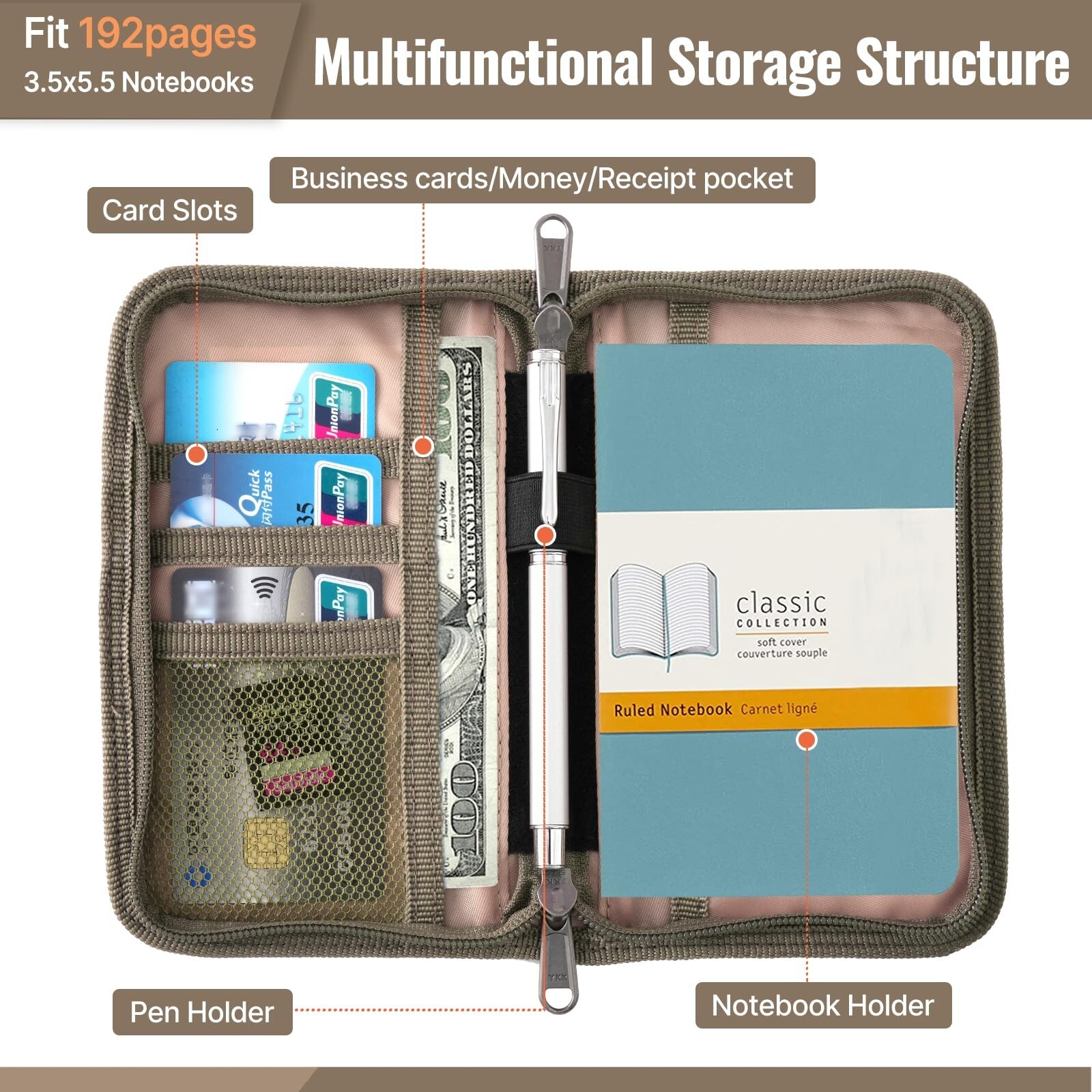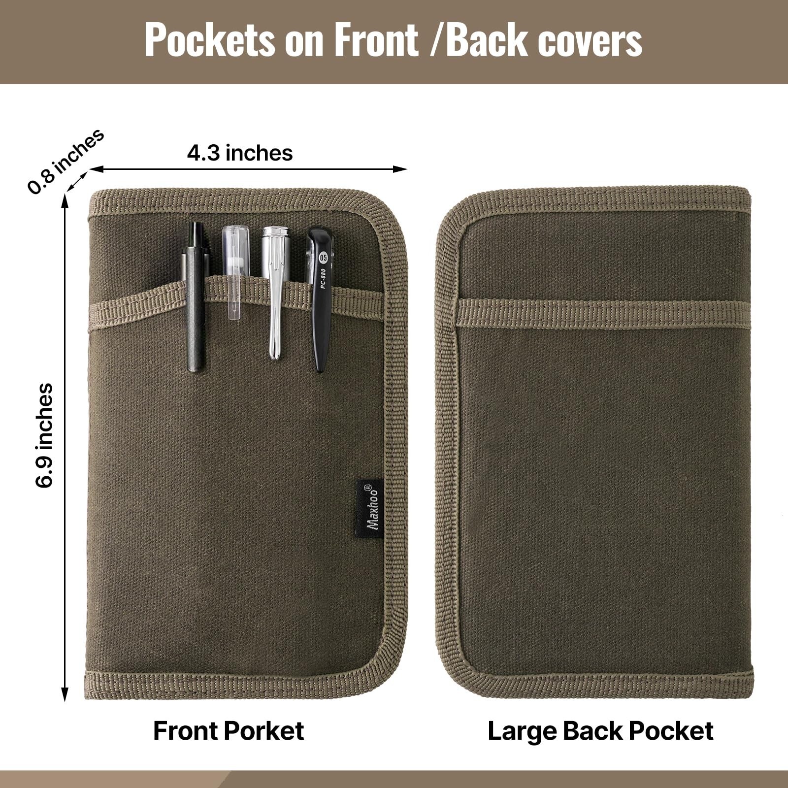 Journal Cover for Field Notes Notebooks, Pocket Notebook Cover for Moleskine Cahier 3.5 x 5.5, Waxed Canvas Journal Notebook Planner Sketchbook Cover with Zipper Pen Holder (Olive) Product Details Brand: Maxhoo Color: Olive Theme: Book Style: travel Special Feature: Waterproof Number of Items: 1 Pattern: Solid Color Binding: Notebook Unit Count: 1.0 Count Manufacturer: Maxhoo Manufacturer: Maxhoo Brand: Maxhoo Item Weight: 3.84 ounces Product Dimensions: 7.09 x 4.33 x 0.79 inches Color: Olive Closure: Zipper Material Type: Paper Number of Items: 1 Manufacturer Part Number: MH-FNB-3.5-5.5 Date First Available: August 15, 2023 Designed for Field Notes Notebook - This Pocket notebook cover is designed to hold your Field Notes, passport, multiple cards, and small accessories in one safe place. It fits most 3.5 x 5.5 notebooks, including Moleskine Cahier, planners, journals, and sketchbooks. The cover is perfect for students, writers, business professionals, and travelers who need to keep their notes and documents organized. Card Slots and Pockets- In addition to its pen holders, this journal cover is also designed with three card slots and two pockets. You can store your small notebook in the right pocket and cash in the left pocket. It's also perfect for storing your credit cards, ID cards, or other small accessories. It's a versatile and practical accessory that's perfect for everyday use. Multiple Pen Holders- This journal cover is designed with two pockets on the front and back cover to hold multiple pens or small tools for quick access. It also has a pen loop design in the middle to securely hold your pen so that you can use it anytime. Whether you're a writer, artist, or student, this notebook cover is perfect for keeping all your writing tools organized and easily accessible. Durable and Water Resistant- Made with high-quality black nylon material and a YKK zipper, this notebook cover is durable and water-resistant, ensuring proper protection of your pocket notebook from the elements. It's perfect for outdoor adventures or business travel. Perfect Gift for Any Occasion - This 3.5 x 5.5 notebook cover makes a thoughtful and practical gift for your family and friends for their birthday, anniversary, Father's Day, Valentine's Day, Christmas, graduations, or any special occasion. It's perfect for anyone who values organization and practicality, such as students, writers, business professionals, journalists, and travelers. Maxhoo Journal Cover designed to keep your field notes, pens, cards, and small accessories organized and protected. Made with high-quality and waterproof black nylon material, this notebook cover is perfect for business travel, outdoor adventures, or everyday use. With its versatile and functional design, this notebook cover fits most 3.5 x 5.5 notebooks, including Moleskine Cahier, planners, journals, and sketchbooks. It features a convenient pen holder in the cover and two pockets on the front and back cover to hold multiple pens and small tools for quick access. The cover is also designed with card slots and an accessory pocket to hold multiple cards and small accessories, like U-disk, SD card, charging cable, postcards, business cards, or bank cards. It can even be used as a passport holder, making it a practical and versatile gift for travelers. The durable and water-resistant cover is designed to protect your pocket notebook from the elements, ensuring that your notes and documents stay safe and secure. The YKK zipper ensures proper closure and adds an extra layer of protection. This 3.5 x 5.5 notebook cover is perfect for students, writers, business professionals, journalists, and travelers who value organization and practicality. It makes a thoughtful and practical gift for any occasion, such as birthdays, anniversaries, Father's Day, Valentine's Day, Christmas, graduations, or any special occasion.
