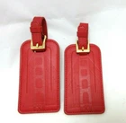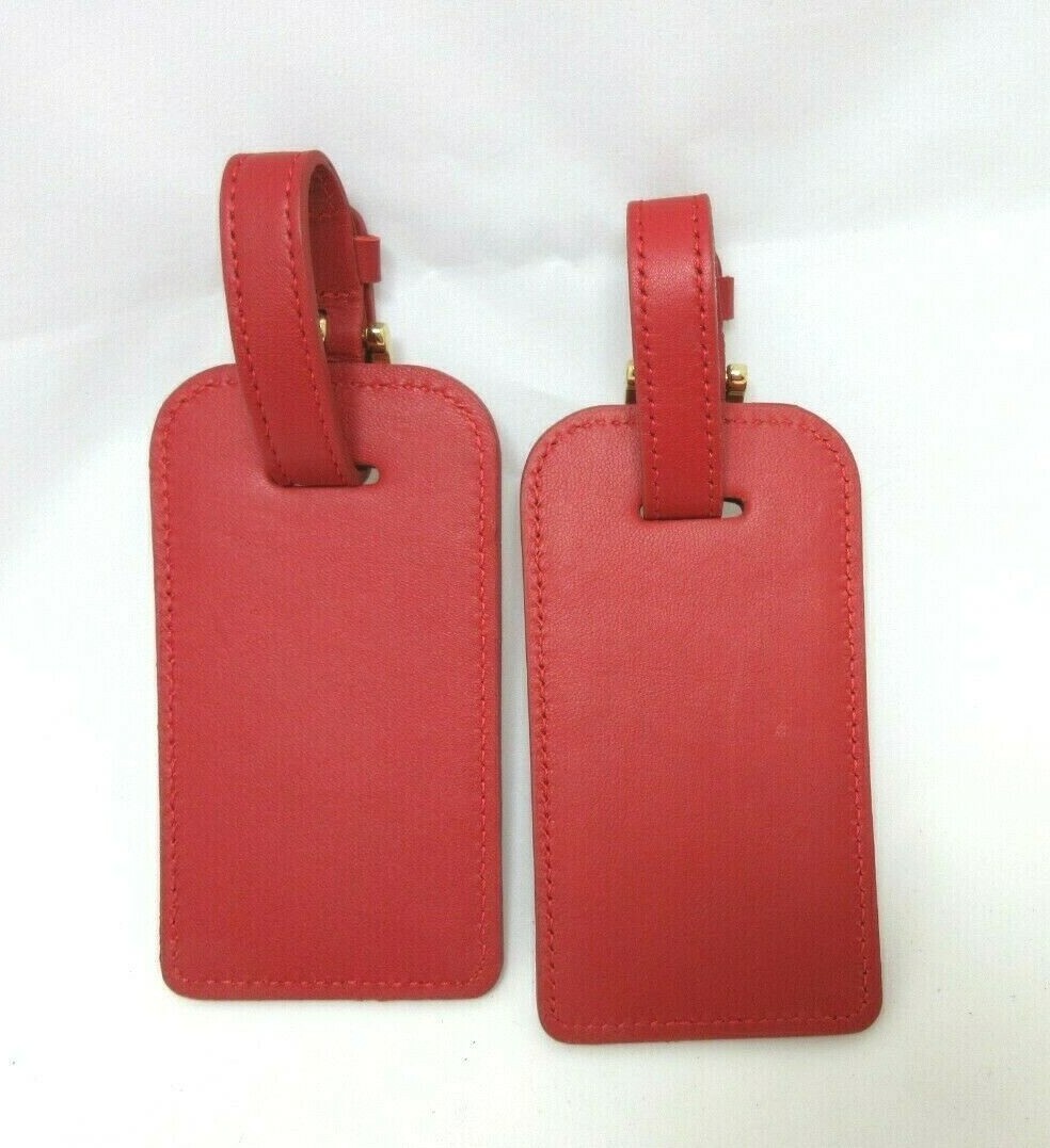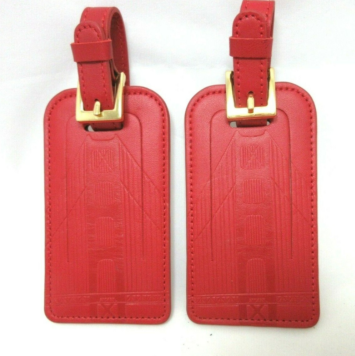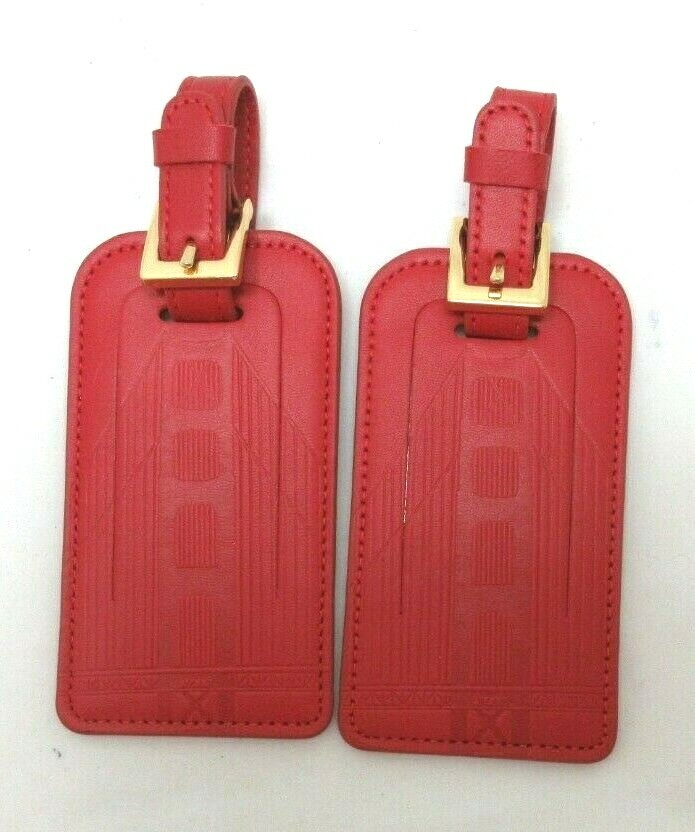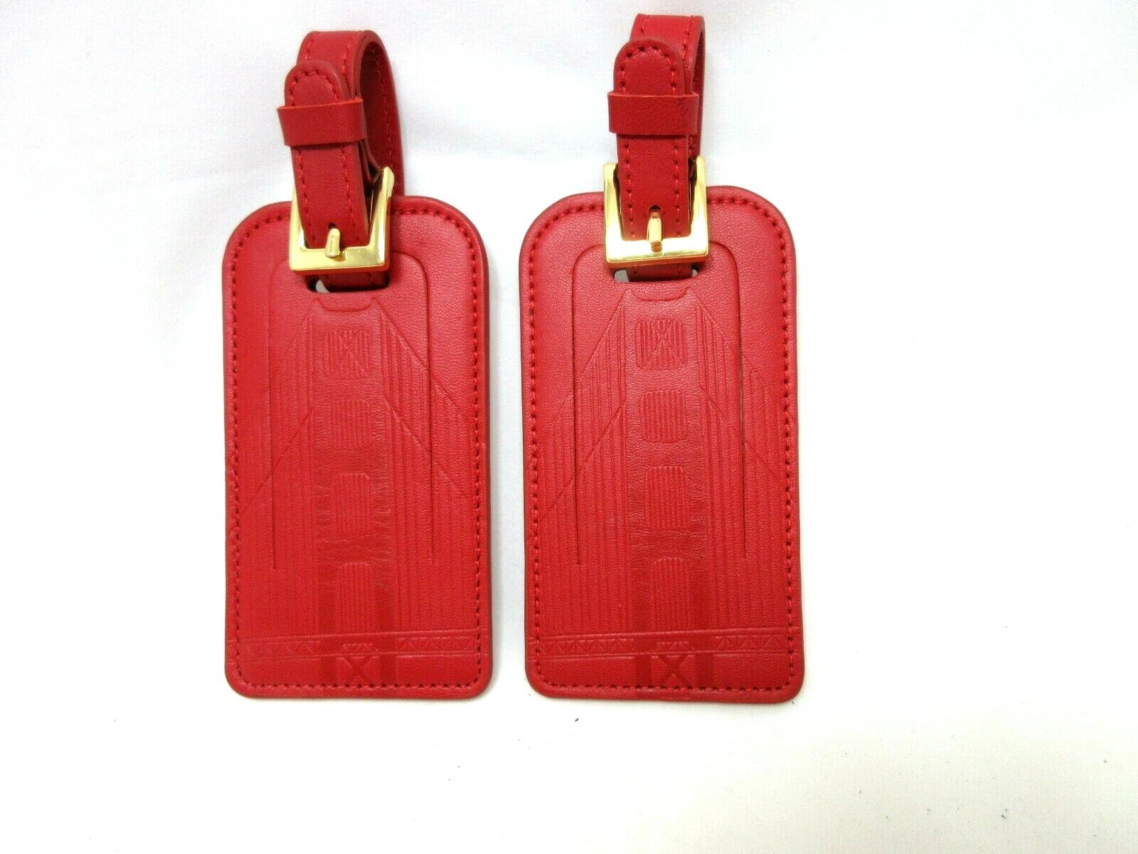 New A matching set of two red leather luggage tags Leather is embossed with an image of The Golden Gate Bridge in San Francisco It will be easy to locate your luggage with these attached. The sturdy bag tag can conceal your identity unless needed. Size: 6-1/4" x 2-1/2" Made in the Graphic Image factory in Melville, NY Last photo for reference only