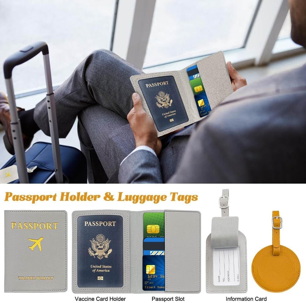 PASSPORT HOLDER & LUGGAGE TAG SET - Keep your travel essentials organized with this passport holder and easily identify your luggage with this convenient luggage tag set. STYLISH & DURABLE - Made of high-quality PU leather, this passport cover with airtag is both stylish and durable. SAFE & CONVENIENT - The passport and vaccine card holder combo is perfect for those who value safety and convenience. HOLD MOST IMPORTANT DPCUMENTS - With ample space for your passport, tickets, and other documents, this travel passport holder case is ideal for frequent flyers. IDEAL GIFT - Whether you're traveling solo or with a partner, this passport organizer for 2 is a must-have accessory for any trip. And it also a great gift to friends who will travel abroad.