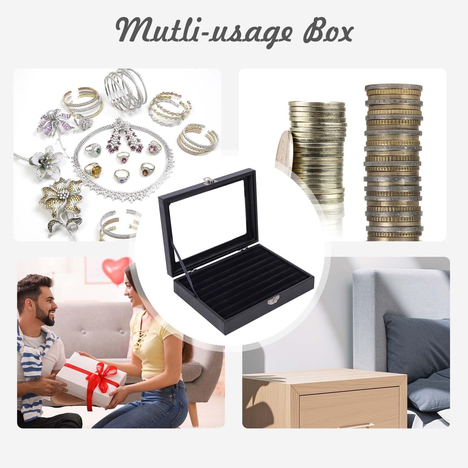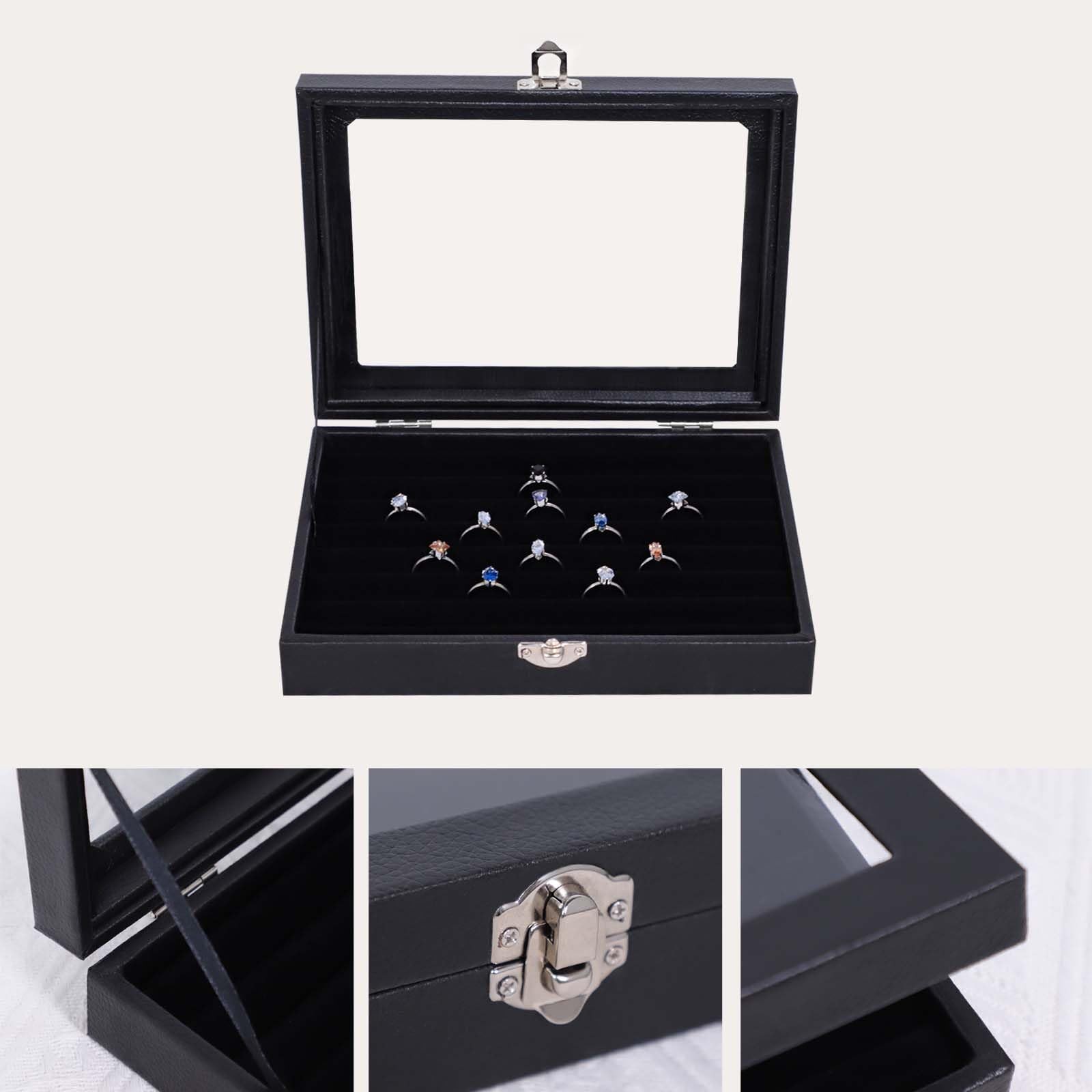 The Ring Organizer Box is the ultimate storage solution for your precious ring collection, designed to hold 30-50 rings with ease. Crafted for both functionality and elegance, this spacious ring box features a soft velvet-lined interior that protects your rings from scratches and keeps them securely in place. The transparent glass lid allows you to admire your collection at a glance, while the sturdy metal clasp ensures your rings stay safe and dust-free. Perfect for both personal use and professional display, this ring organizer is ideal for jewelry vendors, collectors, or anyone who loves to keep their rings organized. The premium leather exterior adds a touch of sophistication, making it a stylish addition to your vanity, dresser, or jewelry store. Its compact yet spacious design makes it easy to store or transport, ensuring your rings are always within reach. Whether you're organizing your everyday rings, special occasion pieces, or an entire collection, the Ring Organizer Box offers durable, elegant, and practical storage. It also makes a thoughtful gift for women, jewelry enthusiasts, or anyone who appreciates a beautifully organized space. Key Features: Holds 30-50 rings for ample storage Velvet-lined interior to protect and display rings Transparent glass lid for easy viewing Sturdy metal clasp for secure closure Premium leather exterior for a luxurious look Compact and portable design for home or travel Perfect for jewelry vendors, collectors, and ring enthusiastsKeep your ring collection organized, protected, and beautifully displayed with the Ring Organizer Box – the perfect blend of style and functionality for every jewelry lover! Easy to carry: The size of the Jewelry Storage Box is 8in X 6in X 1.7in. The product is lightweight, easy to carry, easy to store, and does not take up too much space. No matter where you are, the Ring Organizer Box helps organize your rings, earrings, brooches, and other jewelry Elegant Faux Leather Jewelry Organizer: The small jewelry box is expertly crafted from premium faux leather, with a soft velvet fabric liner to protect your valuables. This elegant jewelry organizer is perfect for women and girls who appreciate style and security, offering a beautiful way to store your rings, earrings, and bracelets Lockable and Dust-proof Design: Featuring a lockable metal buckle, this jewelry box ensures your precious items are kept safe and secure. The clear glass lid that lets you easily view your collection, making it an ideal choice for those who want to organize their jewelry and trinkets, whether at home or while traveling Perfect Gift for Jewelry Lovers and Collectors: The jewelry box is a thoughtful gift for anyone who loves jewelry, collectibles, or keepsakes. It’s perfect for storing jewelry, coins, trinkets, or even small collectibles, offering a stylish and practical solution for any occasion Versatile Storage for Jewelry and More: With a velvet-lined interior, this jewelry organizer includes a dedicated earring holder, ring holder, and bracelet holder, along with compartments that can also be used as a bead organizer, coin holder, or trinket box. Its compact design makes it easy to take with you on the go