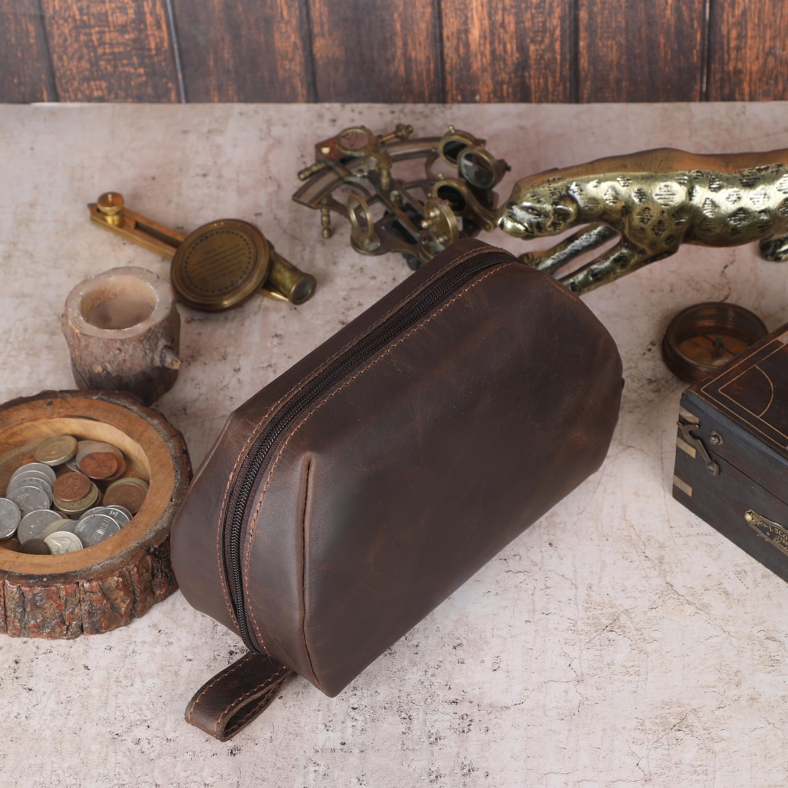 Leather Travel Makeup Bag Organizer for Women, Clear and Large Makeup Case with Brush Holders, Countertop Organizer, Large Makeup Pouch, Professional Makeup Toiletry Kit Bag (Brown) Product Details Product Dimensions: 9 x 3.5 x 5.9 inches Item Weight: 6.7 ounces Department: Unisex Manufacturer: CestAntiQ Country of Origin: India Item model number: makeup_pouch_Large_Brown Handcrafted Luxury: Genuine leather large makeup bag, 9 x 5.9 x 3.5 inches, crafted by CestAntiQ for superior durability and style. Spacious Interior: Large capacity design opens flat for easy access; features dividers and handle for efficient organization. Versatile & Stylish: Ideal for travel, can be used as a makeup organizer, toiletry, or bathroom bag for both men and women. Exceptional Quality: Crafted from full-grain rustic leather, this large makeup bag (9 x 5.9 x 3.5 inches) combines durability with a sophisticated aesthetic. Secure & Easy to Maintain: This large makeup bag is designed for daily use, featuring a smooth, easy-to-clean lining and a custom metal zipper that securely encloses your valuables, perfect for maintaining and protecting makeup and small personal items. Perfect Gift Choice: Elegant large makeup bag, ideal for birthdays, anniversaries, and holidays; a thoughtful and practical gift.