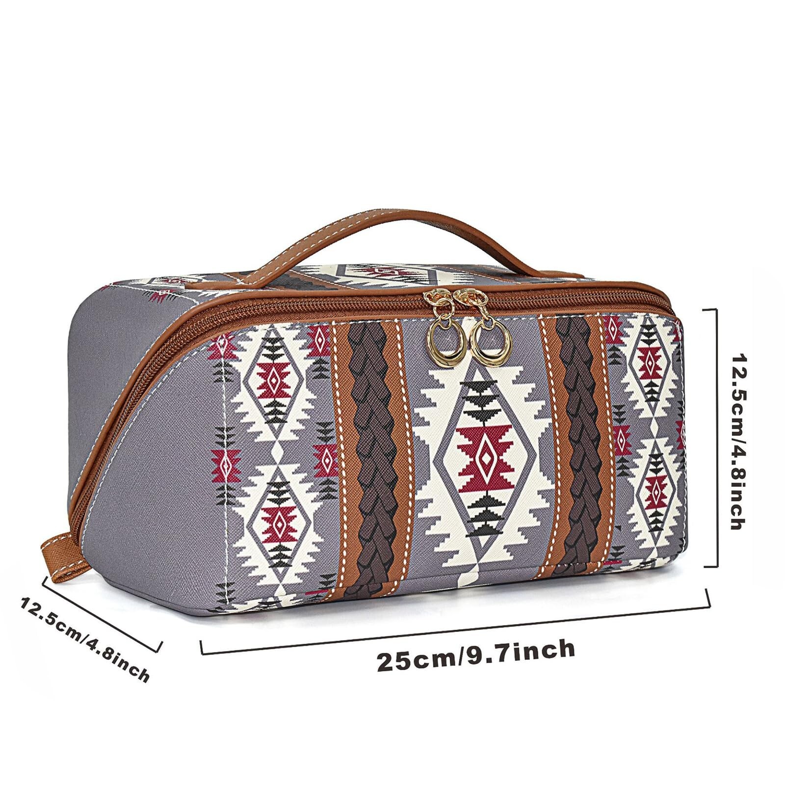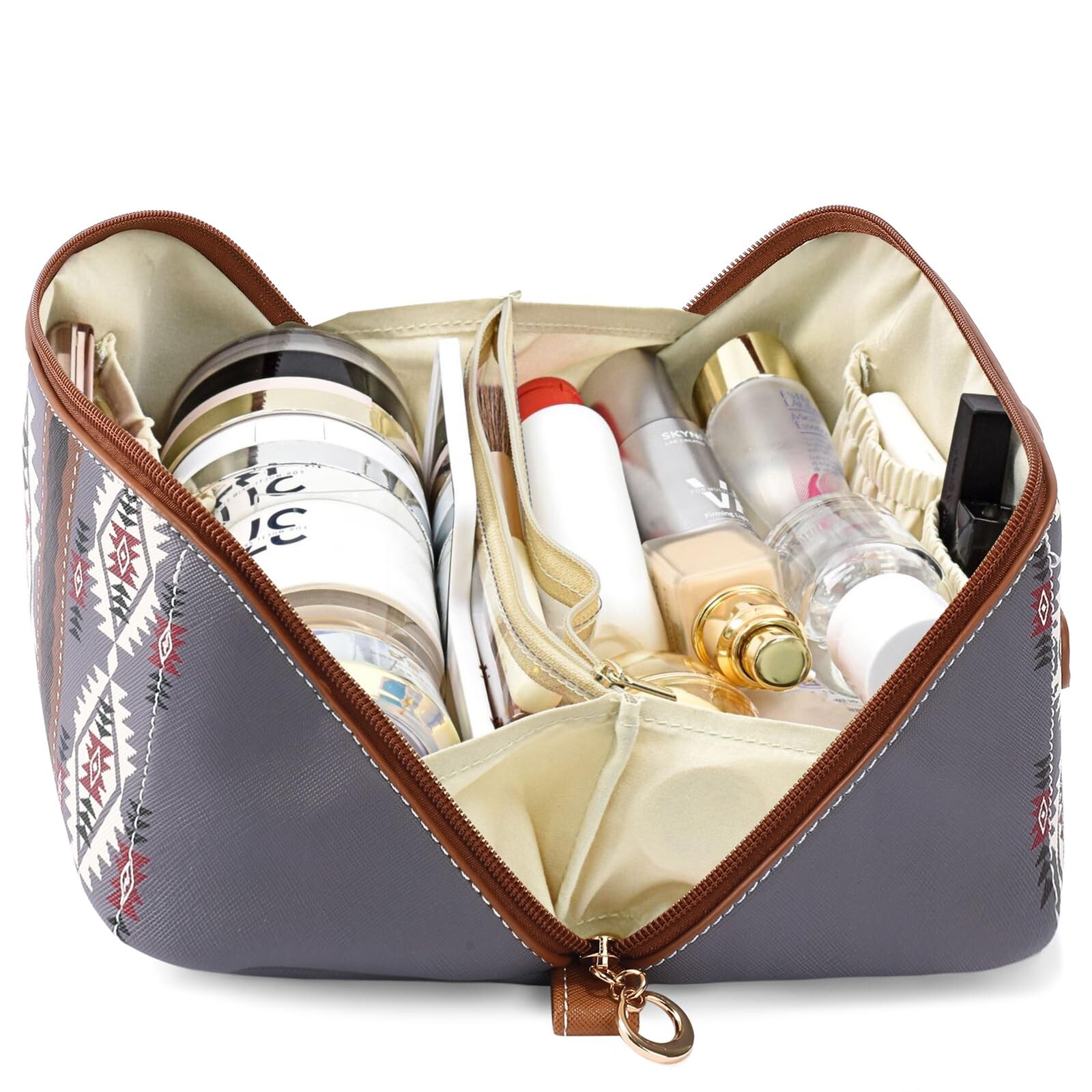 Travel Makeup Bag for women, Large Capacity Cosmetic Organizer Bag Leather Toiletry Bag for Women Open Flat Portable Pouch with Divider and Handle Product Details Color: Purplish White Brand: AMXNX MPN: 913-ZBS UPC: Does not apply EAN: Does not apply Product Dimensions: 9.7 x 4.8 x 4.8 inches Item Weight: 3.53 ounces Department: Women Manufacturer: AMXNX Country of Origin: China Higt Quality - PU leather fabric is easy to clean and has a waterproof surface. The dual zipper head is sturdily constructed for a smooth zipper. The handle strap provides more convenience for use, you can hang the makeup bag on a towel rack, shower rod, or wherever you need it. Medium Size, Large Capacity - Measures 9.7*4.8*4.8 inches. Large opening and large capacity design makes the cosmetic bag easy to access and easy to carry, with a large capacity that can easily hold all makeup essentials and tools. Separate Compartment - The main compartment with a special compartment for makeup brushes and small compartments ensures that your cosmetics are organized and easily accessible. Keep your cosmetics clean, organized, and within reach. Multifunctional - The makeup bag is suitable for all kinds of daily or travel use, the makeup bag can also be used as a toiletry bag, cell phone organizer, storage bag and so on. Suitable for long and short weekend trips or camping. Make every trip have exquisite makeup! Ideal Gift - Express your love to your wife, girlfriend, female friends and mother. The AMXNX makeup bag is a thoughtful gift for delicate women. It will become a must-have for her when she travels.