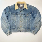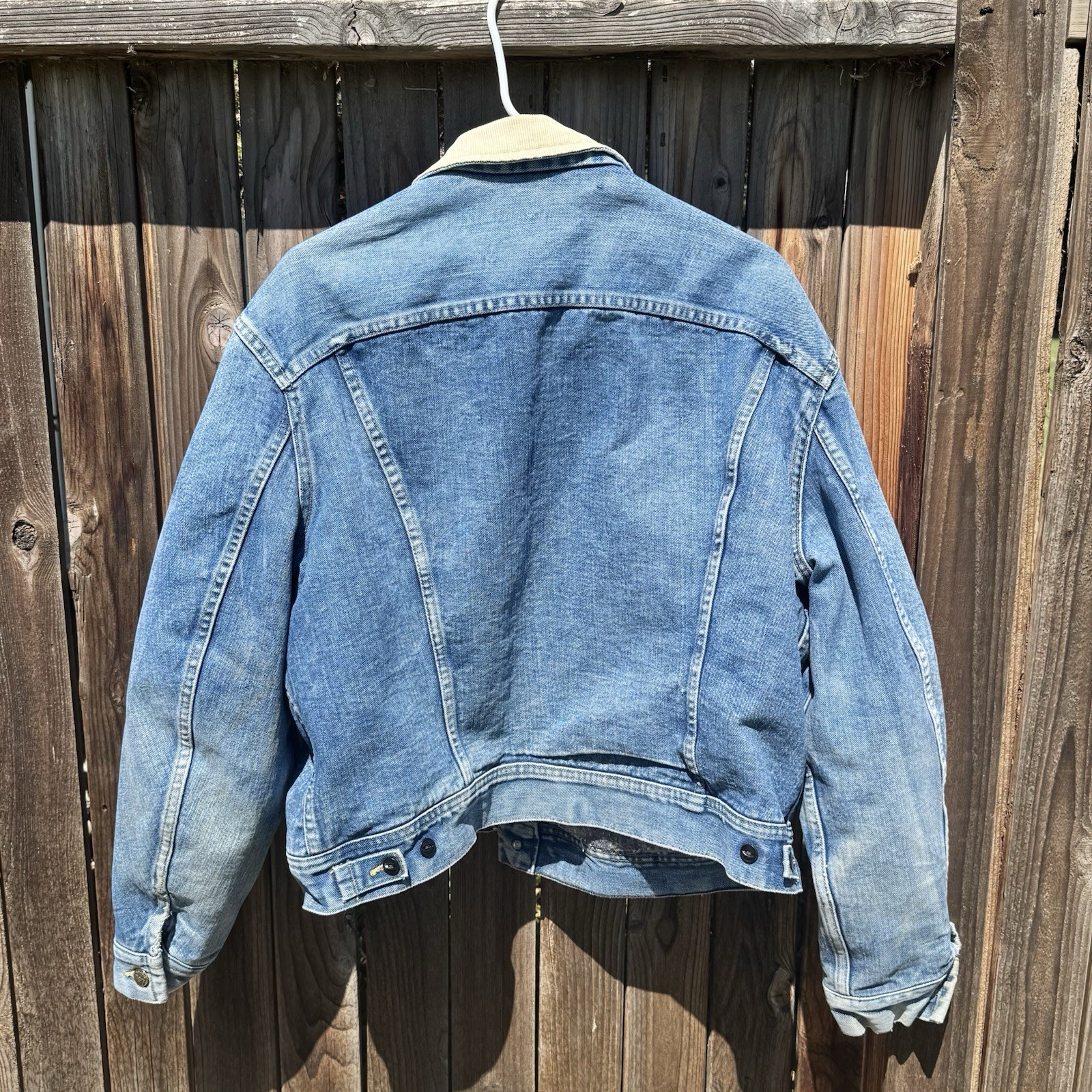 Lee Storm Rider Denim Jacket Size 50R Blanket Lined Vintage 70s Made In The USA This jacket is preowned and in good condition. Jacket has some signs of wear from use and age. Has some stains and a few small holes. Blanket lining on left bottom inside is coming apart. Getting thin going up on both sides. Collar is clean. All button are present. Denim is soft and broken in. See photos for details. Fast Shipping!!