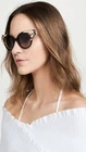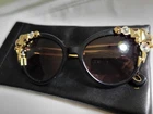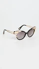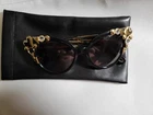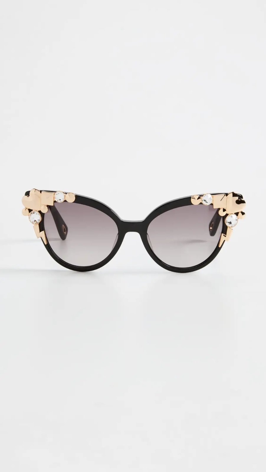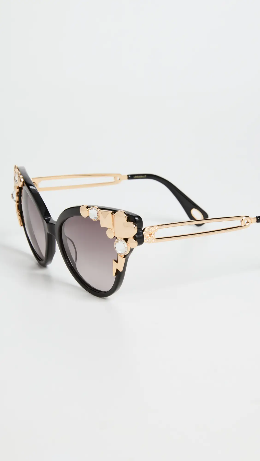 lele sadoughi cat-eye sunglass New in Bag Jet Studded Classic Chelsea Studded Cat-Eye Sunglasses. ∙ Hand-mixed jet acetate ∙ Hand-embellished with 14k gold plated brass heart and lighting bolt shaped charms and round crystals ∙ 14k gold plated bezel settings ∙ Featuring 3" crystal embellished safety pin charms along each arm ∙ Temple tip cut outs ∙ Measures 6" wide by 2 1/4" tall ∙ 100% UVA/UVB protection Studded Chelsea Cat Eye Sunglasses final sale