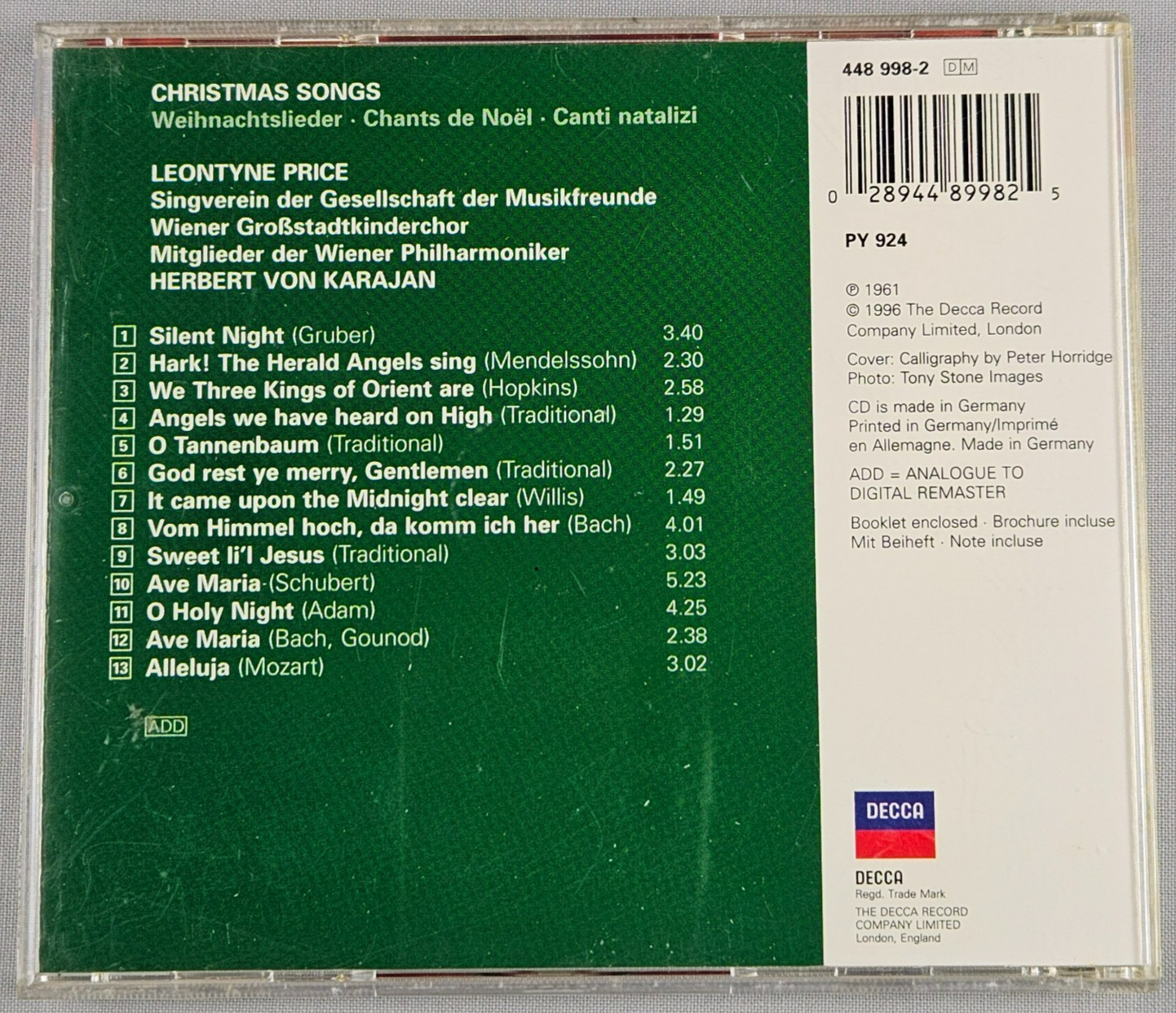 Leontyne Price + Herbert Von Karajan - Celebrate Christmas Same day shipping on orders placed before 8am, Monday to Friday. Domestic Post: Free post Australia wide. Express post & other tracked services are available at the checkout. International Post: AU$24.95 for international orders. AU$2.00 for each additional CD. For Example: 5 CD's will be AU$24.95 + AU$8 = AU$32.95 *Does not apply for CD Box Sets, Box Sets will be an additional AU$5 per Box Set. *There will be VAT added for some countries. If the postage doesn't combine automatically at the checkout, please contact us for an invoice with combined shipping. Explore our store to see if there's anything else you're interested in.