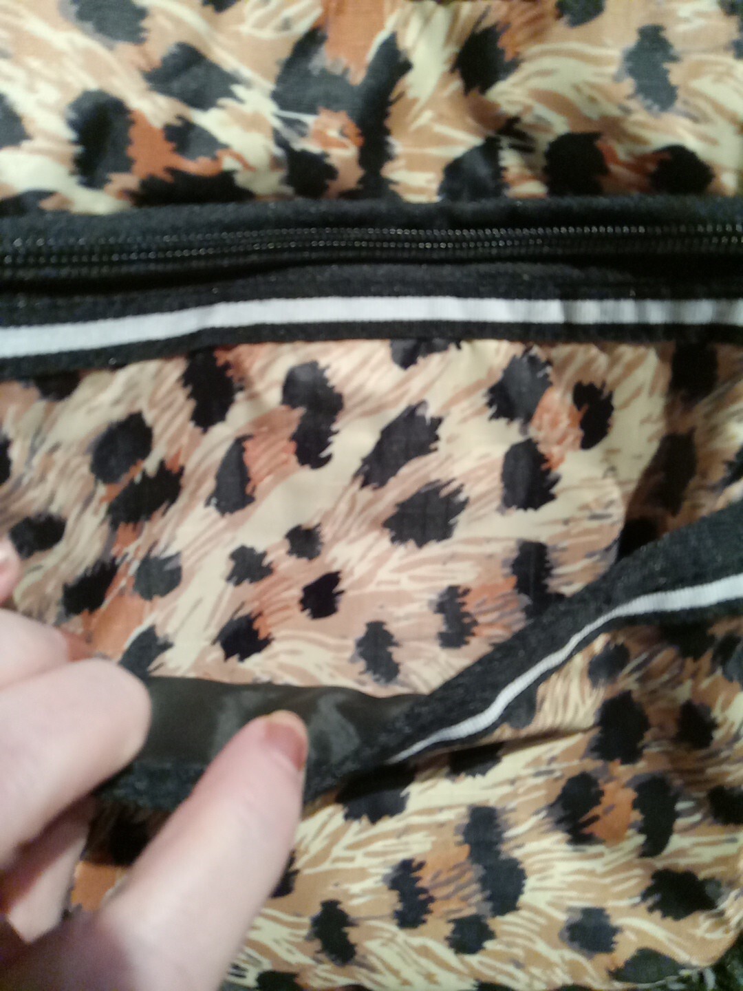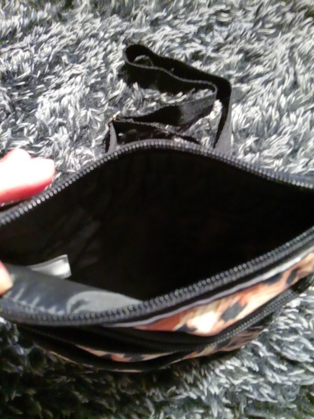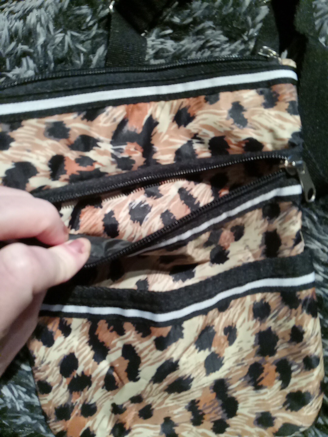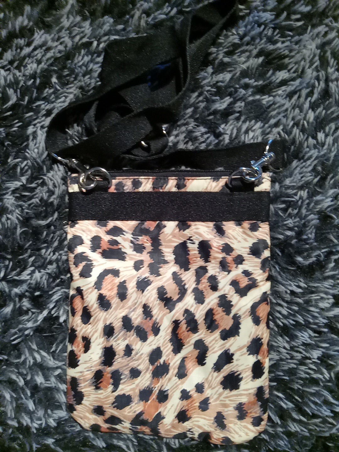 This stylish crossbody bag is perfect for any occasion. With a unique leopard print design, it's sure to turn heads. The bag is made of high-quality coated nylon material and features a convenient zip closure. The adjustable cross-body strap makes it easy to carry, no matter where you go. With a slim depth and small size, this bag is perfect for traveling or casual outings. The black nylon lining and gold-plated hardware add a touch of sophistication. The bag features a variety of compartments and pockets, making it easy to organize your belongings. Don't miss out on this one-of-a-kind accessory!