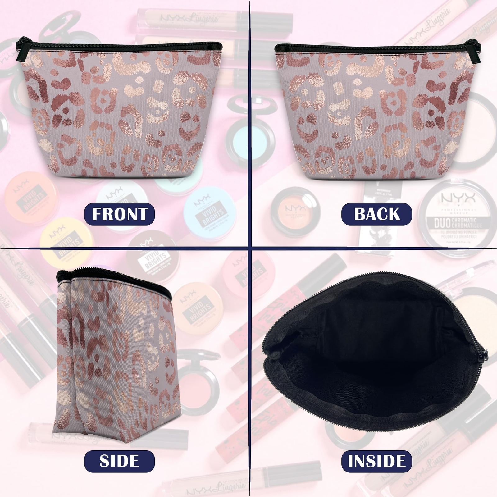 Makeup Bag Leopard Rose Gold Cosmetic Bag for Women Waterproof Large Capacity Travel Toiletry Accessories Organizer 9.5×5.9 Inch Product Details Color: Leopard Rose Gold Brand: DEMACYA MPN: Does not apply UPC: Does not apply EAN: Does not apply Product Dimensions: 9.5 x 5.9 x 3.2 inches Item Weight: 2.12 ounces Department: Women Manufacturer: DEMACYA Country of Origin: China Lightweight And Portable Size9.55.9 inch.And the foldable design makes it easier to be folded into your suitcase. Our makeup bags are stand wear and tear and lightweight. They are made of soft polyester waterproof material,With a zipper closure for ensuring your items not easy to fall off,And easy to open and close.This fabric makes it stay sturdy all the traveling time. LARGE CAPACITY This makeup bag can store not only your cosmetics, but also charging cables, cell phones, essential oil, toiletries, skincare and so on. Keeps all your stuff well so you don't have to go looking for everything all the time. ATTRACTIVE DESIGNMakeup bag organizer adopts HD printing technology, and there are kinds of cute, elegant, funny, lovely small cosmetic bags for your choice, in addition, it is the perfect item for every season all the year. MULTIPLE PURPOSESThis travel cosmetic bag is convenient for organizing all travel essentials so you wont struggle with them when you are on the go. It can also serve as a cosmetic organizer,jewelry organizer,toiletry bags, travel bags, wash bags, storage bags to neet your different needs. PERFECT GIFTThis cosmetic bag can basically meet your daily use, which is ideal for travel, business trip, gym, camping, bathroom and outdoor activity. It is also a nice gift to give on days like Birthdays, Graduation, Valentine's Day, Mother's Day, Thanksgiving, Christmas, or just share them with your family and friends