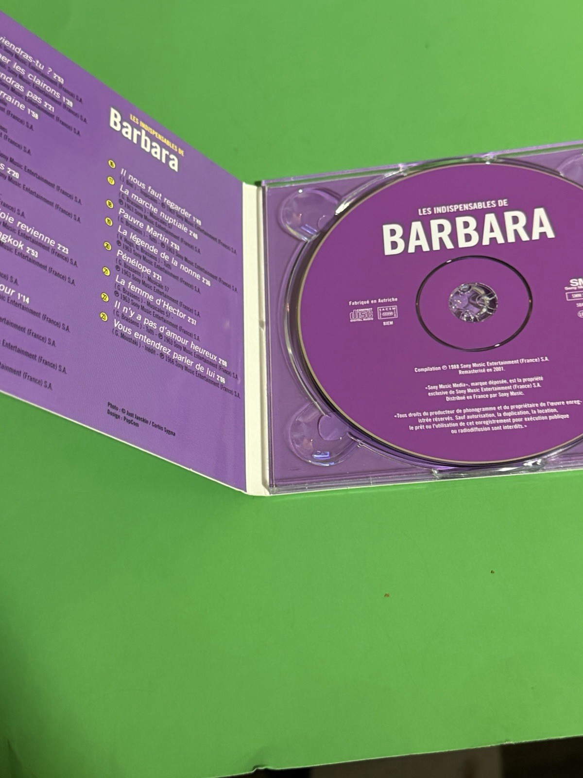 "Les Indispensables de Barbara" by Barbara (France) is a world music album in French, released by Sony Music Media in 2001. This CD features a collection of songs by the renowned artist, with a run time of 57 minutes. The album comes in a standard jewel case and is an import from France, making it a unique addition to any music collection for fans of French and Belgium music.
