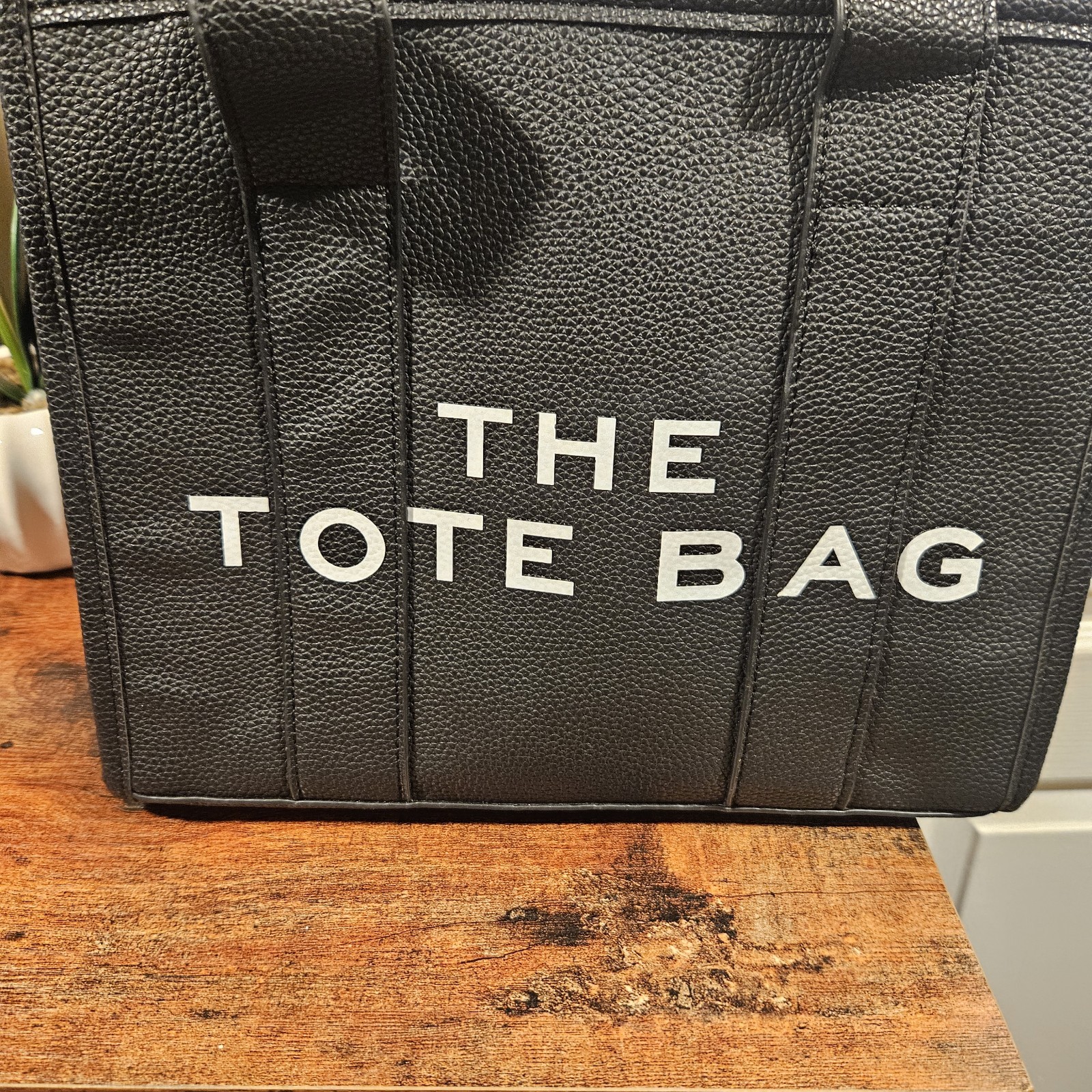 The "The Tote Bag" satchel bag is a stylish and practical accessory for women. Made of faux leather in a sleek black color, this tote features top handles, black and white design gold zipper with one organizer pocket inside.