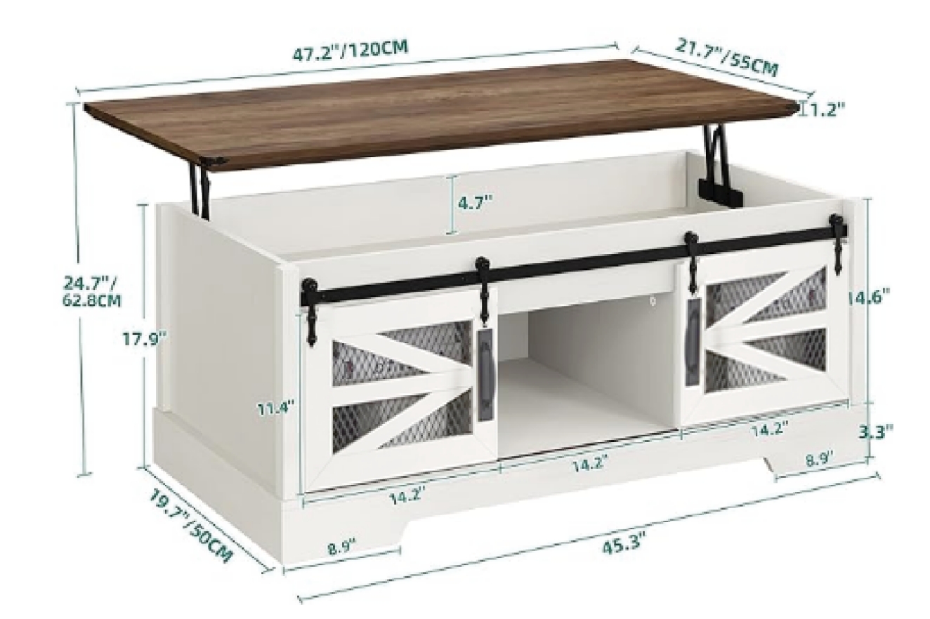 Lift Top Coffee Table 47.2" Center Table for Living Room Farmhouse Coffee Table Lift Top Coffee Table 47.2" Center Table for Living Room Farmhouse Coffee Table Rustic Farmhouse Style : Our farmhouse coffee table bundles functionality and farm aesthetics into one. Features unique farmhouse wood grain finish, the metal trim adds more exquisite. Not only keeps the living room neat and tidy but match furniture perfect.Whether you're entertaining guests or enjoying a quiet evening in, this table provides ample surface space for your needs without overwhelming the room. Ample Storage & Versatile Use : The coffee table features multiple hidden compartment and convenient sliding barn door for storing books, magazines, or small items. The farmhouse style of the coffee tables for living roomcan be better adapted to other types of furniture, catering to different needs and occasions, whether as a work area, entertainment space, or temporary dining table. Lift Top Design: This coffee table offers both enclosed and open storage spaces, allowing easy access to your belongings and maximizing space utilization, the sturdy lift mechanism ensures smooth and safe lifting and lowering of the tabletop. Sturdy and Durable Structure: Thanks to the high-grade engineered wood and well-structured design, this table can withstand the challenge of long-term use. The thickened tabletop with 1.2'' can hold up to 150 pounds and can easily accommodate your items with no problems. What's more, the enhanced 4 support legs plus one extra mid-leg further enhance the stability and weight-bearing capacity of the coffee table, with 100% No Wobble. Packaging Protection & Easy Assembly : Living room tables with premium outer packaging materials and meticulous internal packaging procedures, the small coffee table remains intact throughout the logistics process, ensuring every item received is flawless. The coffee tables comes with simple and clear assembly instructions, assembly videos, and labeled accessories, allowing even beginners to easily complete assembly. Payment Delivery Returns Feedback We accept Payoneer only. All major credit cards are accepted through secure payment processor PayPal. Payment must be received within 7 business days of auction closing. If you have bought multiple items from me, you can send me one payment for all the items instead of paying for them individually. When you click the Pay Now button, eBay will automatically determine if there are other items you have won or purchased from me and will combine them for your review. NOTE: Import duties, taxes and chargers are not included in the item price or shipping charges. These charges are the buyer's responsibility. Please check with your country's customs office to determine what these additional costs will be prior to bidding buying. 1. We will delivery out at the handing time when we receive the payment. 2. The delivery time is 3-5 business days to US by usually time.The parcel maybe delay 1-2day of the weekend.Due to the bad weather,Holidays,Hot Season ect.the parcel maybe delay,If you have any problems,mssage us,we will try our best to solve it. 3. We ship to your eBay address. Please make sure your eBay address is correct before you pay. 4. If you want to change the shipping address,message us before our send out. 5. We cannot deliver your order if your state is PR. 1. If you donot receive the items at the delivery time,the parcel has broken/missing,Please message us before you open case/return,we will try our best to solve it. 2. We offer a 30 day return policy from checkout winning date. 3. An RMA number is required for all returns. Message us for return instructions. Items Returned without a RMA number will not be processed. 4. Items defective upon receipt must be packaged in their retail packaging as if new and returned with a detailed description of the problem. 5. Return shipping fees are not refundable.We reserve the right to decline any returns if the above guidelines are not followed. If you are not satisfied with the item for any reason, please do not quick to leave negative/neutral feedback even open request and case without any communication with us. We devote ourselves making EVERY CUSTOMER in 100% Satisfactory and resolve any problem. Thank you for your understanding and recognition,we are always leave positive feedback to all our customers. About Reply: All replies will be sent to your email box, if you do not get response within 24 hours (Sat. & Sun. excluded) please check your eBay My Messages in case that our emails will be filtered automatically by your settings. Type Coffee Table Material Wood Brand Unbranded Item length as shown item width as shown item height as shown