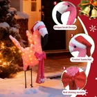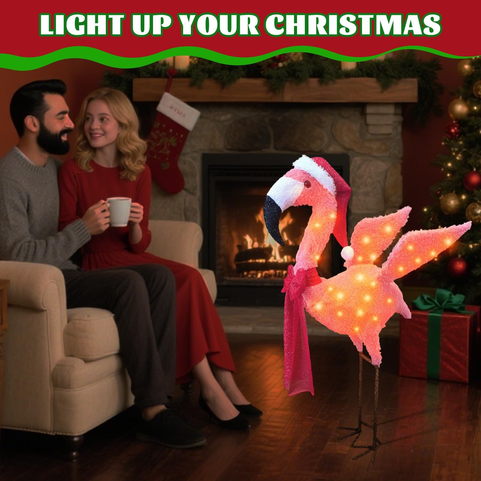 Bring a touch of hometown holiday charm to your front yard with this whimsical Christmas — dressed in a Santa hat, scarf and bright orange wings for a playful spin on classic seasonal décor. Pre-lit and ready to shine, it’s the kind of friendly, eye-catching display that makes neighbors slow down on evening drives, becomes the backdrop for family photos, and sparks smiles during holiday strolls and block parties. Built on a sturdy wire frame with a glittered finish, this dinosaur holds up through the season while remaining light enough for easy handling. The included 5-meter power/transformer cord gives you placement flexibility so you can tuck it on your porch, stage it on the lawn, or pair it with wreaths and inflatables for a coordinated yard display. No fuss — plug it in, pick a lighting mode, and your home is ready for caroling, cookie exchanges, or festive porch hangs. This piece leans into the playful, family-centered spirit of American holidays: it’s perfect for creating memorable Christmas morning photos, entertaining at an ugly-sweater party, or turning your house into the cheerful stop on the neighborhood lights tour. Gift it to the dino-lover in your life or add it to your annual holiday rotation — either way, it’s a unique, conversation-starting decoration that spreads seasonal joy from Thanksgiving through New Year’s. FESTIVE FLAMINGO DESIGN — Add tropical charm to your holiday yard with this 39-inch pink flamingo wearing a Santa hat and scarf, blending fun beach vibes with classic Christmas cheer. BRIGHT, ENERGY-EFFICIENT LED LIGHTS — 100 warm white LEDs provide a cozy, steady glow; all lights remain steadily lit (no flashing). STURDY METAL FRAME & FABRIC COVERING — Built on a durable iron frame and wrapped with soft textured fabric, ensuring both stability and an elegant holiday look that lasts. EASY SETUP & STORAGE — Quick to assemble and lightweight (3.8 lbs per piece). The flamingo packs neatly into a single box (16.5" x 8.7" x 12.2") for convenient off-season storage. PERFECT INDOOR & OUTDOOR DISPLAY — Weather-resistant construction makes it ideal for lawns, porches, gardens, patios, or indoor holiday setups. A delightful statement piece your neighbors will love.