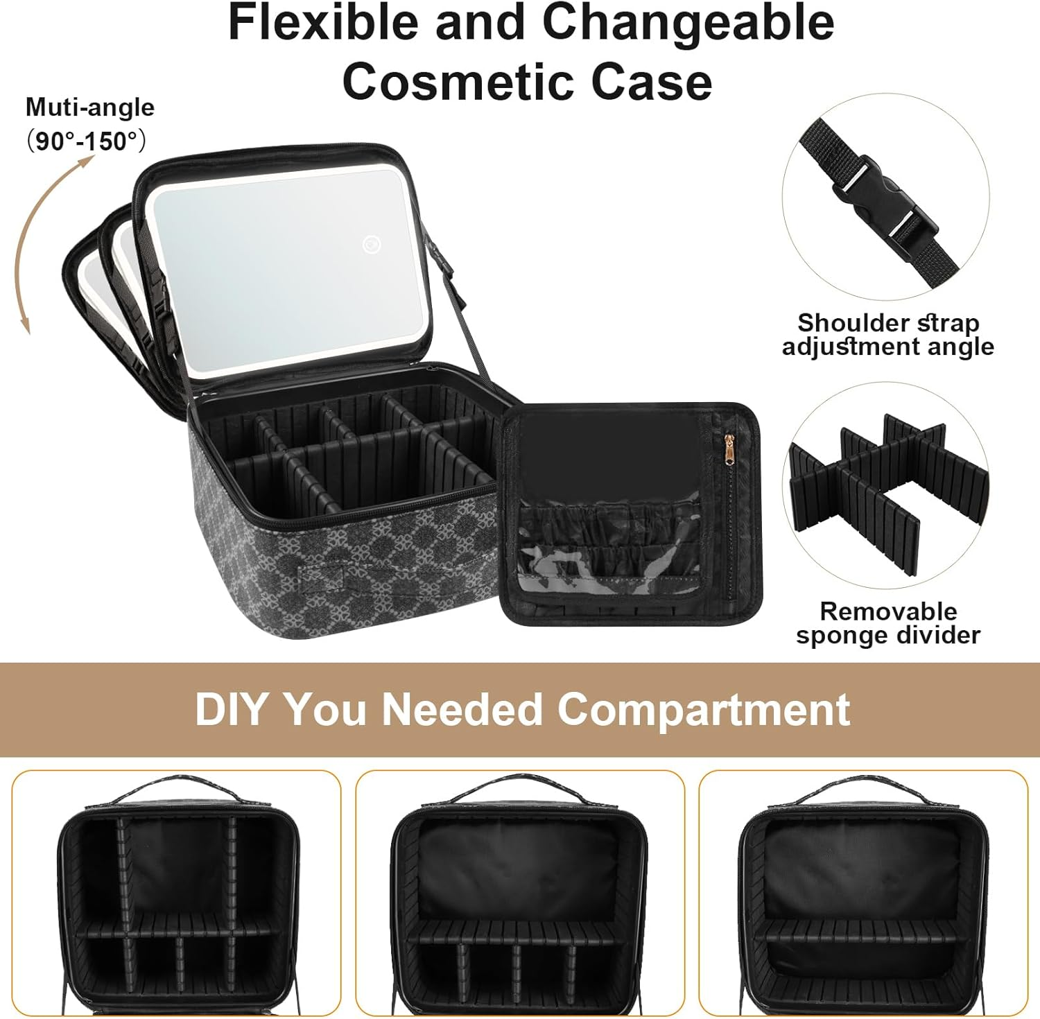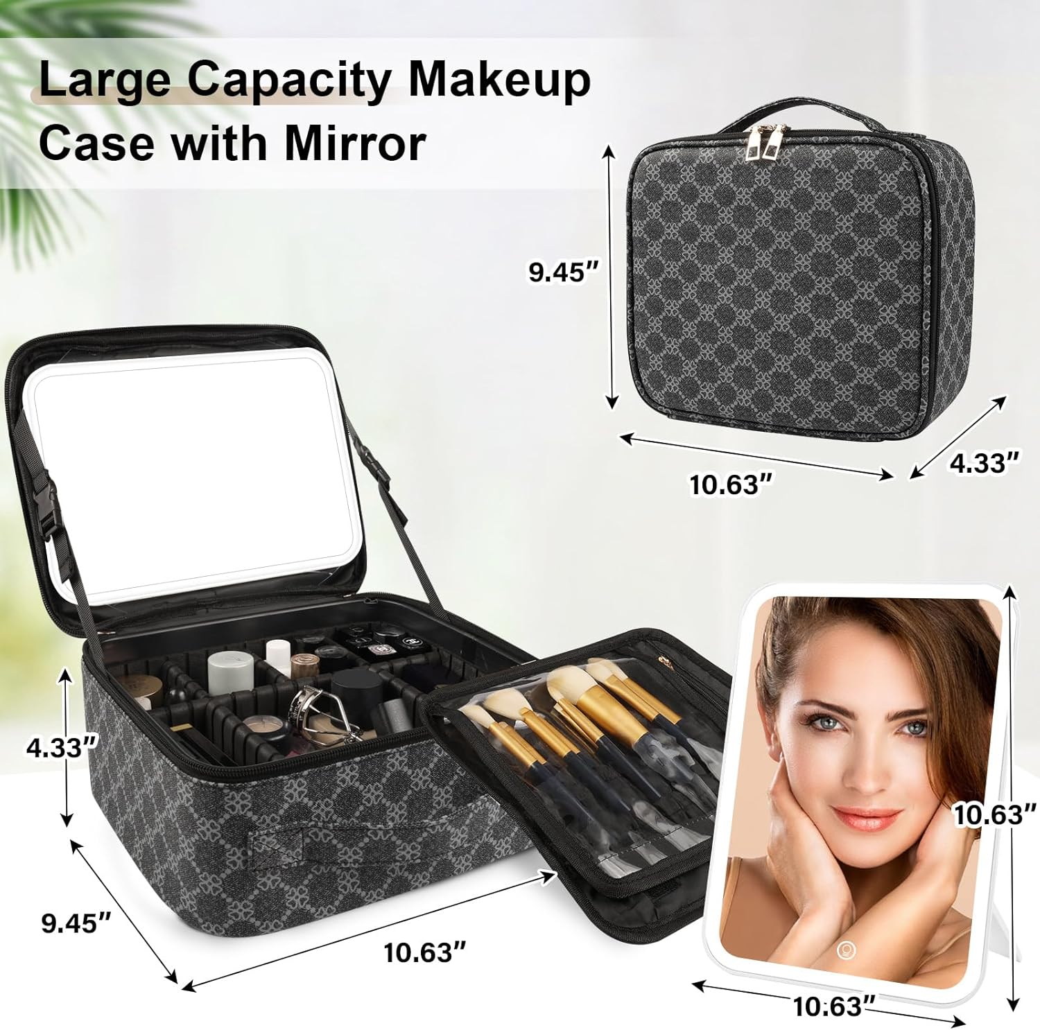 【Perfect Travel Makeup Case】PEEH travel makeup train case designed with storage compartment and makeup brush storage board, equipped with lighted makeup mirror and 10x magnifying mirror, can take it as dresser. Makeup case features a handle, you can bring your cosmetics anywhere, perfect for makeup or travel lovers. Size: 10.63*9.45*4.33inch. 【Smart HD 1X Makeup Mirror】Our travel led mirror with light features a smart light mode and highly sensitive touch control, detachable and chargeable, also with a detachable 10x magnifier mirror. Simply tap to select White Light, Natural Light, or Warm Light, long press to adjust the brightness. And has a 360° rotatable bracket 【Exquisite Workmanship】PEEH makeup bag with light up mirror are made of lychee grain leather, delicate in touch, waterproof and anti-dirty. The zippers are polished, electroplated and waxed. Each makeup organizer case has been embroidered on the leather surface, and the frame of the compartment is embossed, shockproof and anti-wear. The whole cosmetic case is exquisite and durable 【Multifunctional Cosmetic Storage Box】 Our lighted makeup case includes 6 EVA partitions and a brush storage board, have enough space to storage your cosmetic, like lipstick, brushes and so on. Storage compartment inside have anti-drop sponge pad, which can well protect your cosmetics, whether it is placed in the luggage or directly on the car 【100% Satisfaction Guarantee】It can be an ideal gift for mom, girlfriend, wife, etc. on Valentine's Day, Mother's Day, Christmas, and other special festivals. We have a strict quality control system, please feel free to contact us if there is any issue when you receive or use the makeup bag or mirror, and we will get back to you within 24 hours. Product Description