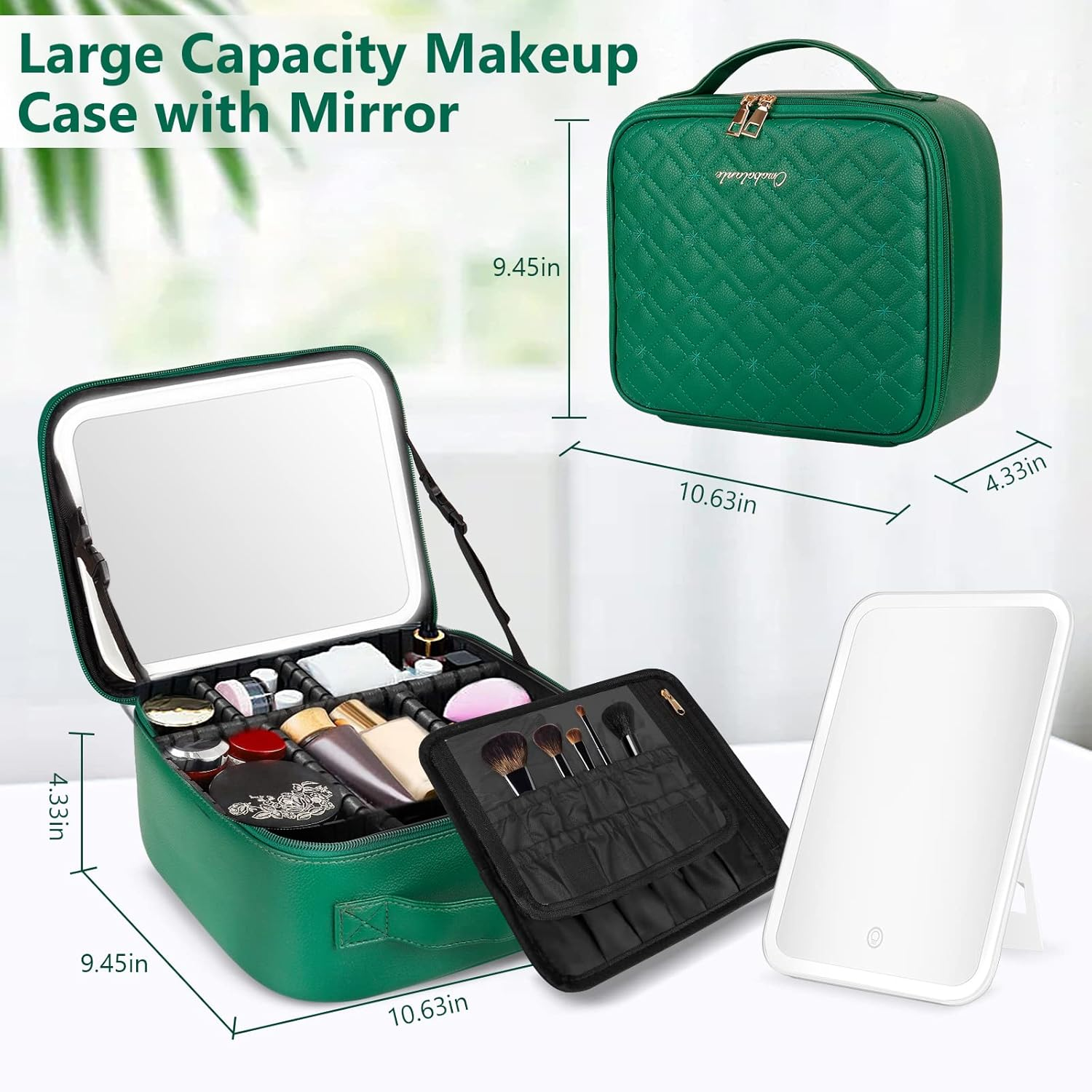 【Perfect Travel Makeup Case】PEEH travel makeup train case designed with storage compartment and makeup brush storage board, equipped with lighted makeup mirror and 10x magnifying mirror, can take it as dresser. Makeup case features a handle, you can bring your cosmetics anywhere, perfect for makeup or travel lovers. Size: 10.63*9.45*4.33inch. 【Smart HD 1X Makeup Mirror】Our travel led mirror with light features a smart light mode and highly sensitive touch control, detachable and chargeable, also with a detachable 10x magnifier mirror. Simply tap to select White Light, Natural Light, or Warm Light, long press to adjust the brightness. And has a 360° rotatable bracket 【Exquisite Workmanship】PEEH makeup bag with light up mirror are made of lychee grain leather, delicate in touch, waterproof and anti-dirty. The zippers are polished, electroplated and waxed. Each makeup organizer case has been embroidered on the leather surface, and the frame of the compartment is embossed, shockproof and anti-wear. The whole cosmetic case is exquisite and durable 【Multifunctional Cosmetic Storage Box】 Our lighted makeup case includes 6 EVA partitions and a brush storage board, have enough space to storage your cosmetic, like lipstick, brushes and so on. Storage compartment inside have anti-drop sponge pad, which can well protect your cosmetics, whether it is placed in the luggage or directly on the car 【100% Satisfaction Guarantee】It can be an ideal gift for mom, girlfriend, wife, etc. on Valentine's Day, Mother's Day, Christmas, and other special festivals. We have a strict quality control system, please feel free to contact us if there is any issue when you receive or use the makeup bag or mirror, and we will get back to you within 24 hours. Product Description