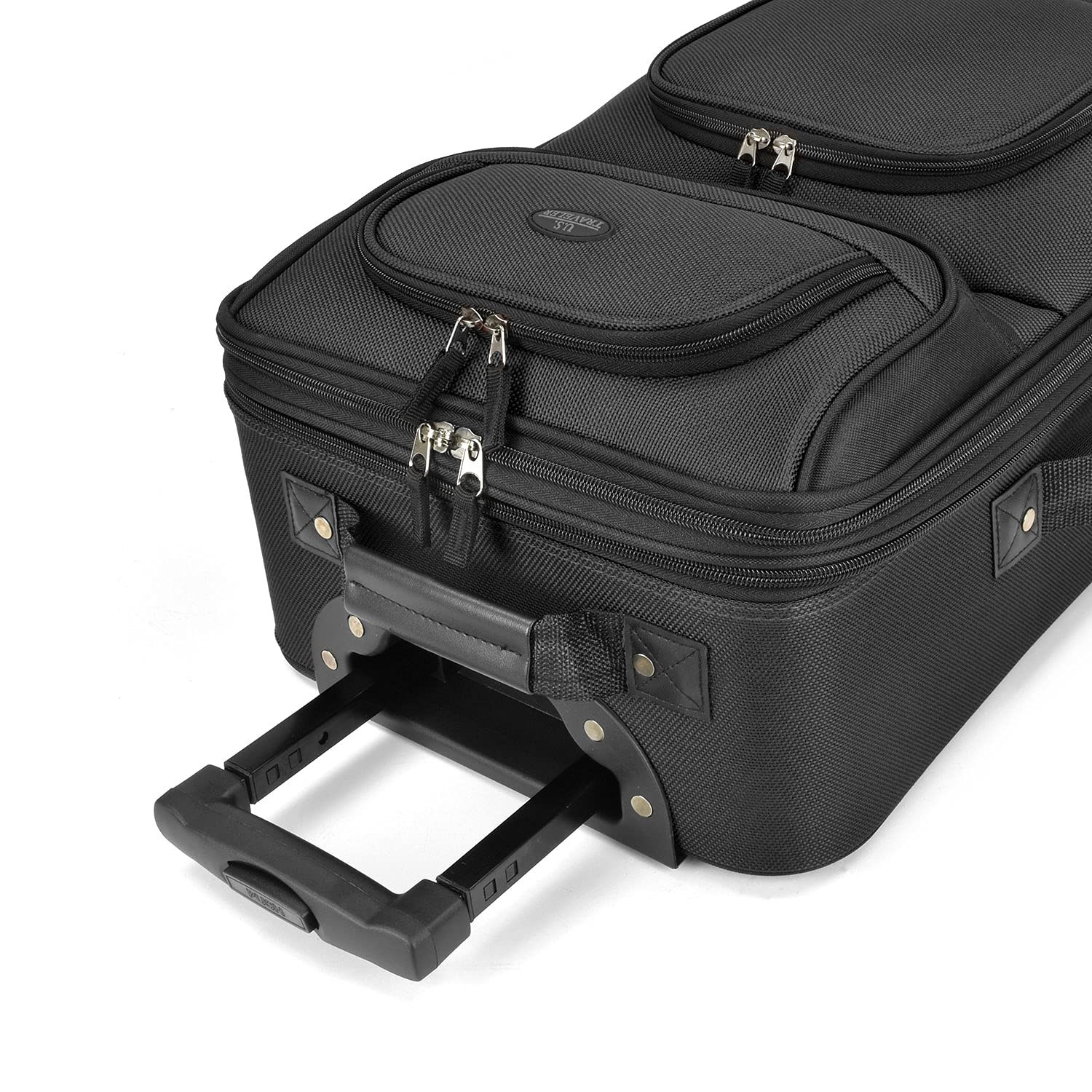 Description Travel in style with this Rio 2-piece Carry-On Luggage Set. It includes a 21" expandable, wheeled upright and a 14" boarding bag. Both pieces of the Rio luggage set meet the FAA carry-on regulations. You can easily slide the boarding bag over the handle of the 21" expandable, wheeled upright, making travel a snap. This US Traveler luggage set's metal hardware holds up to the rigors of the shipping process. Densely woven, 1200D polyester is very strong and keeps water from seeping in through the outside. The handle locks in place securely so you don't have to fiddle with it while you walk. A set of skate wheels make the luggage easier to transport without having to pick it up. Fall in love with our most affordable luggage set, crafted with high-quality polyester construction that exudes elegance and sophistication. Glide effortlessly through the airport with our internal deluxe retractable push-button, self-locking handle system that provides easy maneuvering. Keep your hands free with the piggy-bag-strap that allows for easy carrying of the tote bag together with the rolling bag. Experience the ultimate luxury with our elegant fully lined interior, featuring tie-down straps, and a large interior meshed zipper pocket that provides ample space to organize your belongings. Don't sacrifice style for space - our expandable feature offers more packing capacity, so you can bring all your essentials without compromising on style.