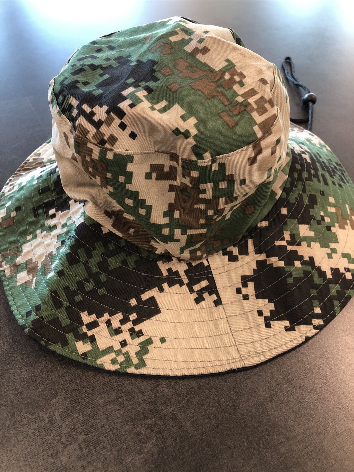 This digital camouflage bucket hat is in good condition. Has an adjustment strap and is a size medium. I wear a 7 1/8 hat size and this fits perfectly with a little room to spare. Thanks