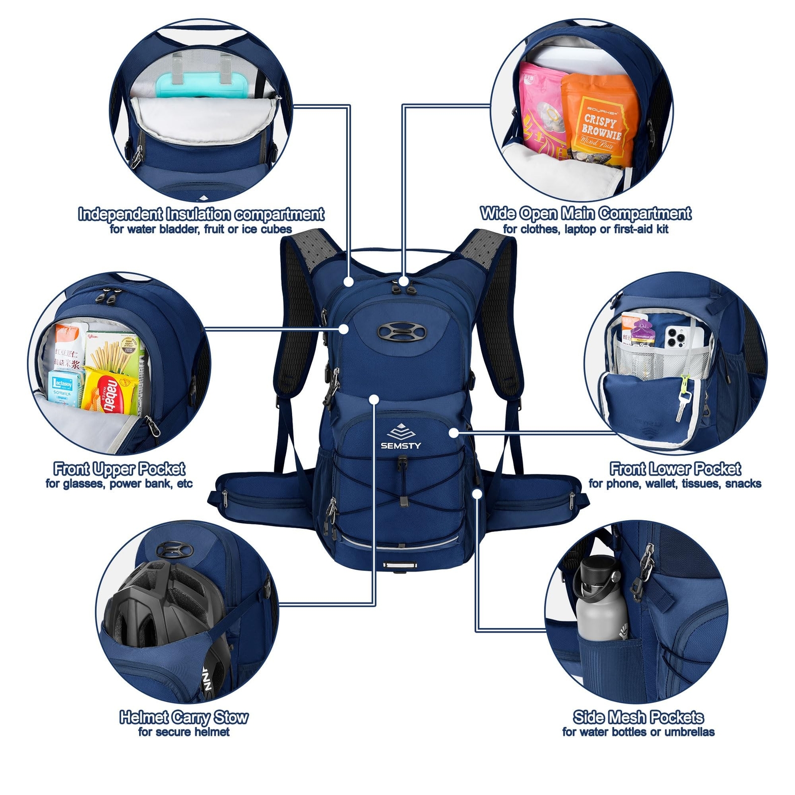Hiking Backpack with Water Bladder 2L/3L Water Backpack Women Men Lightweight Insulation Hydration Day Rucksack for Hiking, Cycling, Running, Climbing, Camping Product Details Brand: SEMSTY Sport: Hiking Item Weight: 1.8 Pounds Strap Type: Shoulder Strap Brand Name: SEMSTY Item Weight: 1.8 Pounds Strap Type: Shoulder Strap Sport Type: Hiking 20L Hydration Backpack: Insulated hydration backpack's overall capacity is 20L+2L water bladder, the water bladder is made of PEVA material and does not contain BPA. Durable, insulation, kink-free sip tube, and push-lock cushioned bite valve; Large 2-inch (5 cm) opening easy to add ice and clean and dry, just bottom up and it will dry on its own. 25L Hydration Backpack:This waterproof backpack weighs only 1.81 pounds in lightweight design. With a 25L capacity and three storage compartments, plus two side waist pockets and stretchy mesh pockets, can fully meet your storage needs, whether it is clothes, lunch boxes, hiking gear,laptop, snacks, keys, mobile phones, and even other outdoor appliances High Flow Bite-Valve: The Easy-Twist mouthpiece doesnt leak, water flows fast and won't drip on your shoulder when locked, making it an ideal cycling backpack and water backpack for running, skiing, snowboarding, and trail running Taste-Free Hydration Bladder: Made from medical grade materials, the water bladder is free from BPA and PVC. There's nothing worse than a plastic taste in your water, this bladder keeps your water tasting fresh, all day Multiple Storage Options: Vibrelli's hydration backpack design has intelligent storage options and pockets without being bulky