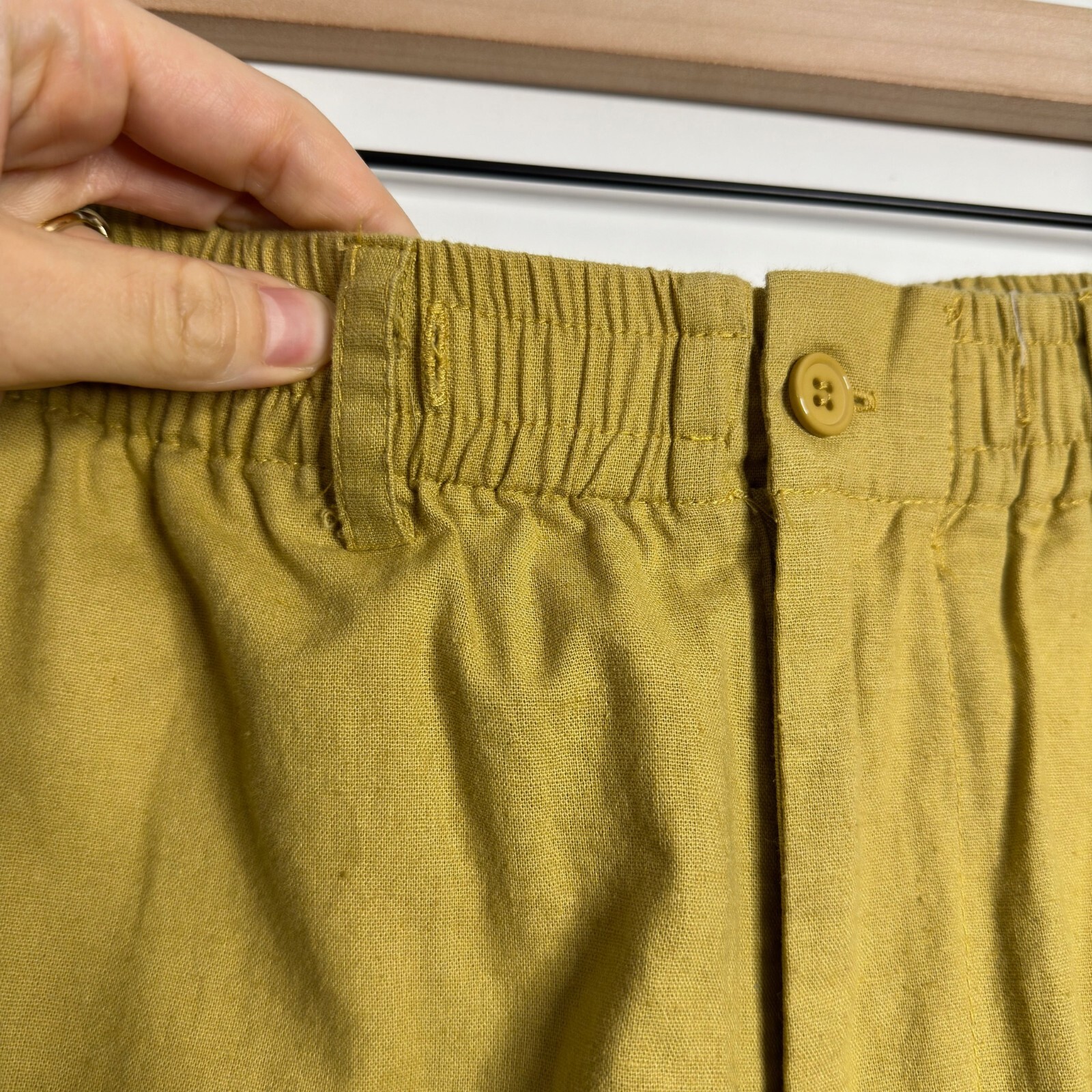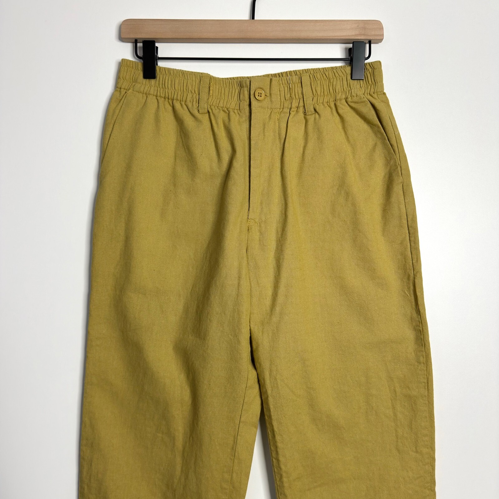 - Women's Hat and Beyond pants, size small - Keywords: elastic waist, button and zip fly closure, pockets, tapered leg, mid-rise, casual, lightweight, muted yellow/green color - 55% linen, 45% cotton - Excellent pre-owned condition, missing waist tie - Measurements taken laying flat: approx 14" waist, 20" hips, 9.5" rise, 30" inseam All items are FINAL SALE so please check measurements to ensure proper fit.