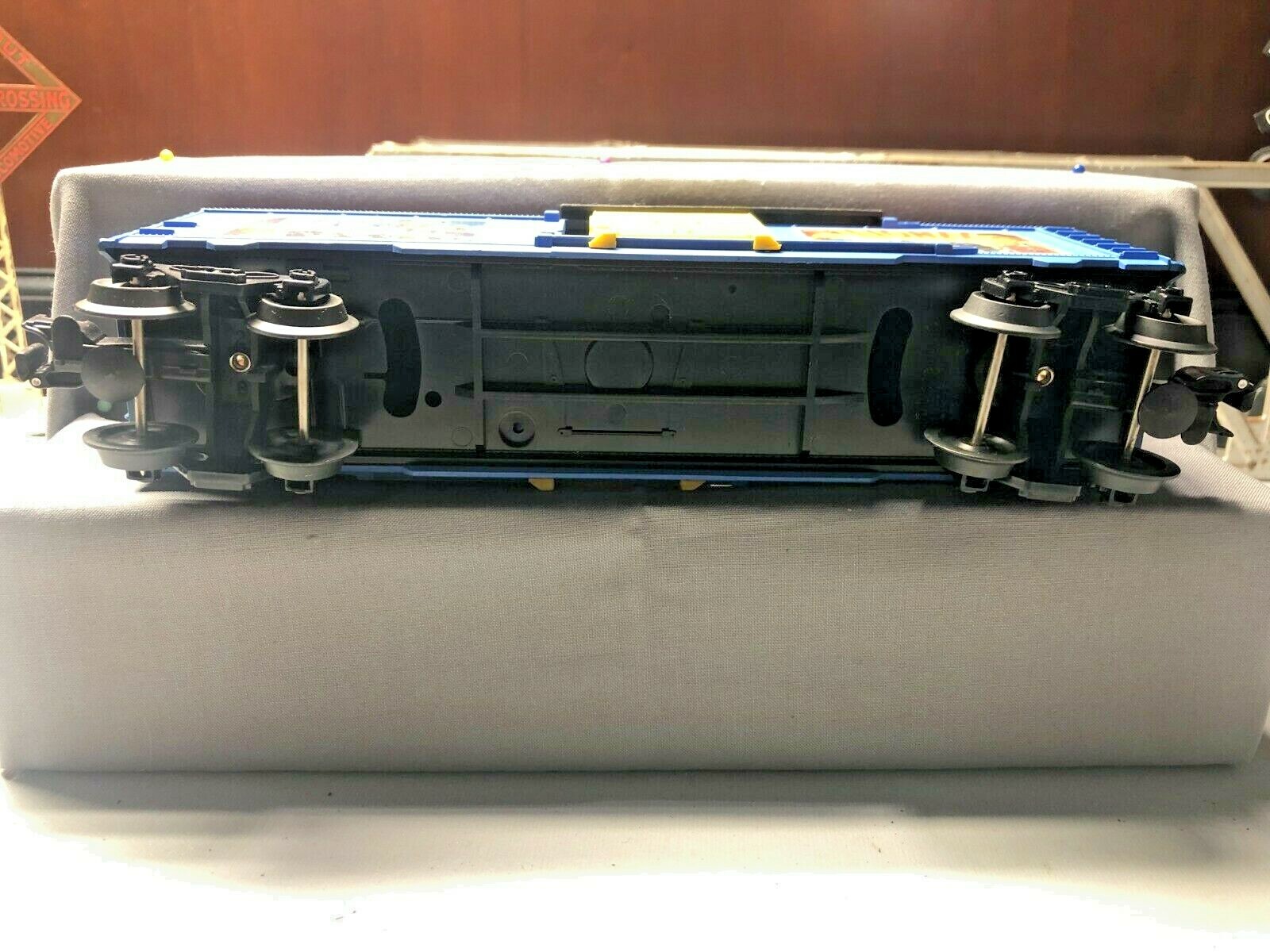 there is no box this was in a set it is in like new condition it has 2 operating magnetic couplers metal wheels & axles i do combine shipping & tracking # is included