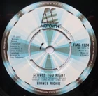 Artist: Lionel Richie Title: Running With The Night Format: 7" Label & Cat No: Motown TMG1324 Grading: EX/EX Year: 1983 Additional info: picture sleeve, Running With The Night/Serves You Right *********************************************************************************** • thespacebar.records have been selling vinyl online for over 20 years. • We don't use stock photos. What you see is what you get. If we have multiple copies we'll send the best one. • If there are any issues when we come to pack up your record we will message to let you know and wait for you to confirm or cancel prior to shipping. • Much of our stock is in near-perfect condition. • Many items are unplayed but are graded conservatively as EX. • We're in the process of adding more photos to our listings. It's a big job. In the meantime if you'd like to see more images of any item, please send a message and we'll fast-track it. • We grade the vinyl 1st and the sleeve (if applicable) 2nd. • If there is only one grading and it seems very cheap, please check the item description carefully as we sell some records without sleeves and some sleeves without records. We always check with buyers before posting these items. • Singles that don't have a picture sleeve are supplied in an original company sleeve where possible. Otherwise they are sent in a plain white sleeve. • Records are supplied with a 400g polythene sleeve for protection. • To prevent seam splits, records are removed from their original sleeves for posting. • Everything is pressed in the UK unless otherwise stated in the item description. • More information/track listings/photographs available on request. Enjoy browsing our shop - Jeff & Catherine