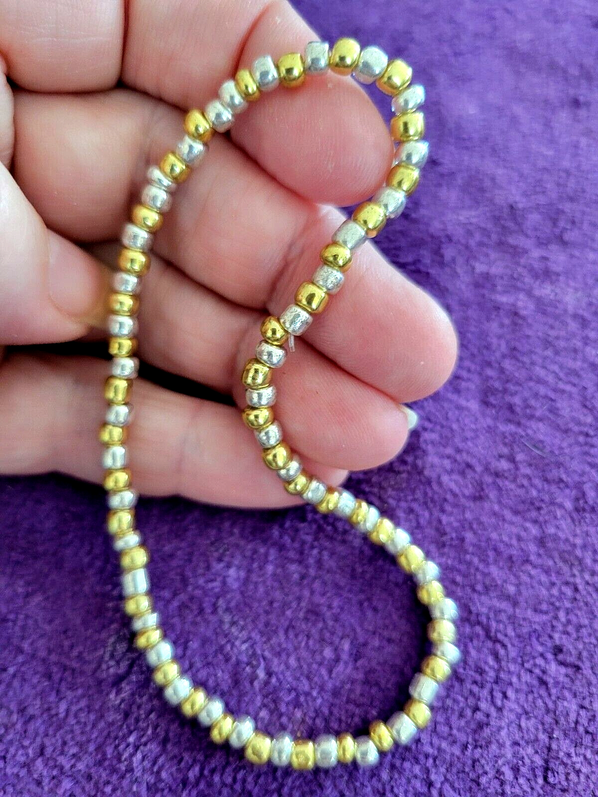 I make ALL of my Anklets in Sizes 9 1/2, 10 1/2, 11 1/2 & 12 1/2. If you need Another Size, just let me Know in the Sales Notes. ~~ 0028900~~ ~Please scroll DOWN to view the entire Listing~ (To use the Magnifying tool to read Tags/Labels and see Closeup views, please choose a picture with your cursor, and then Hold your cursor over the picture. A small magnifying box should appear and will Allow you to see Closeup.) **Liquid Silver & Gold Beauty Bead Beaded Anklet - Energy Life Breath Love - Unique 11 1/2" ** This Anklet is Really Nice, in Excellent Condition, Strung on Strong Elastic for Easy On and Off and a Great addition to Your Wardrobe. Dimensions: 11 1/2" Long Perfect for Yourself or as a Gift! Note to Buyer: I'm sorry postage is so expensive, but I choose to ship your item in a box, so it will arrive undamaged. Also, I Can Create ANY Color Combination of Beads for my Anklets. Just let me know if You Would like a Special Order. No Extra Cost. ~~I'm Great to deal with. Check out my Feedback and my Other Auctions!~~ A+ seller! Super fast shipping, lovely anklet, thank you! I am a repeat customer!!! ~aileen257 Love these ankle bracelets. Shipped fast! ~ikosokar Nice item. Fast delivery. Great communication! ~cinmor99 Item just as described, super fast shipping. Great Ebayer. A++++ ~jennifer315 Please leave Positive & Glowing Feedback and I will be happy to do the same! ~~~~~~~~~~~SMOKE FREE HOME!!~~~~~~~~~~~ Thank you for reading the ENTIRE listing before placing a bid. ~~ Payment MUST be received within 6 days ~~ POLICIES: PLEASE READ BEFORE YOU BID ~Please Ask all Questions BEFORE Bidding - Returns on a Case by Case basis only~ Please read the entire listing BEFORE bidding. **By placing a BID on this item, you are AGREEING to Make Payment and abide by ALL terms, directions & descriptions in this listing.** The Pictures Show the Type of Item you will Receive. The Bead Colors will be the same, but the Bead patterns will be slightly different on the Item you Will receive. Thank Your for Checking out This Listing.